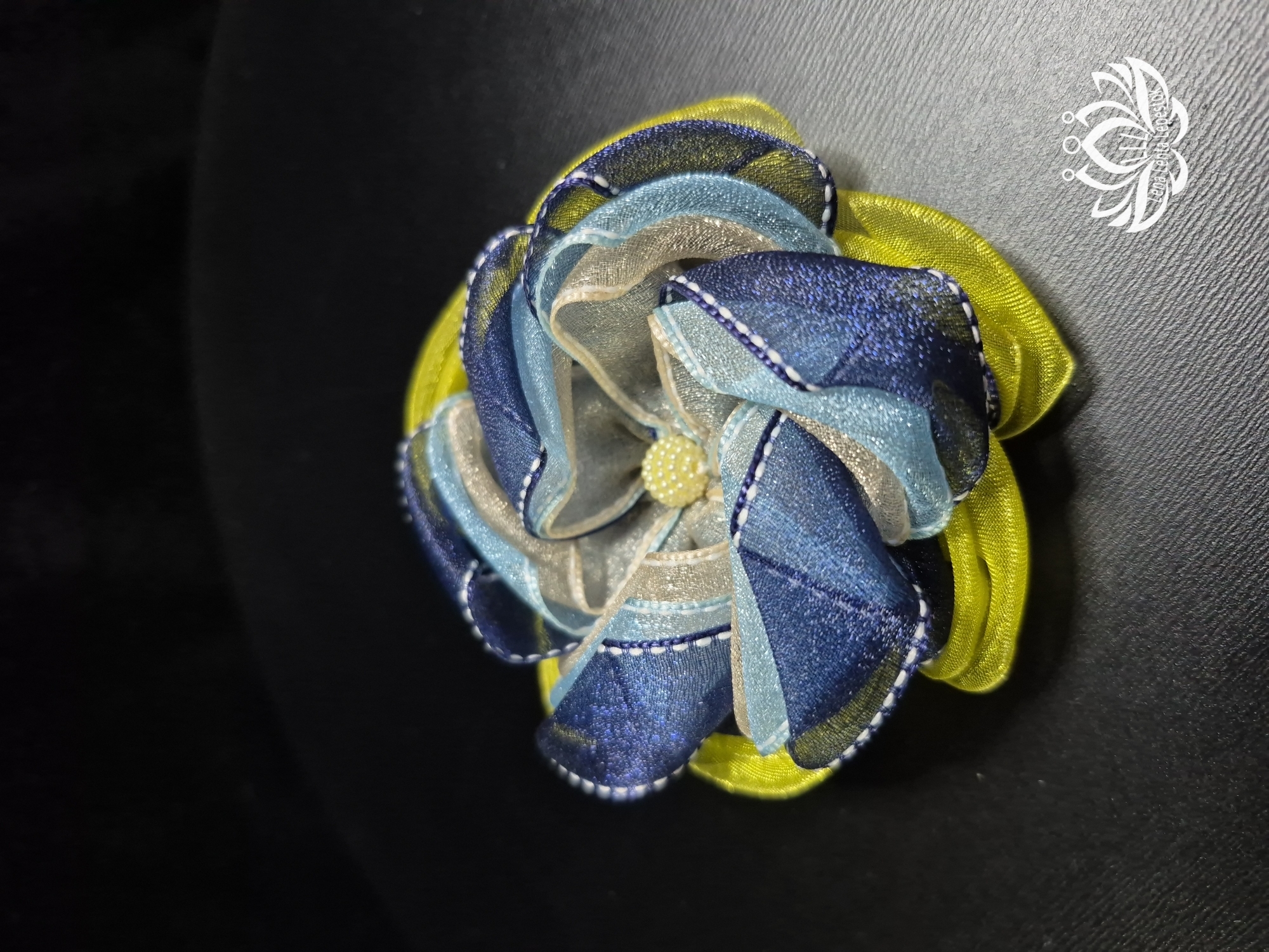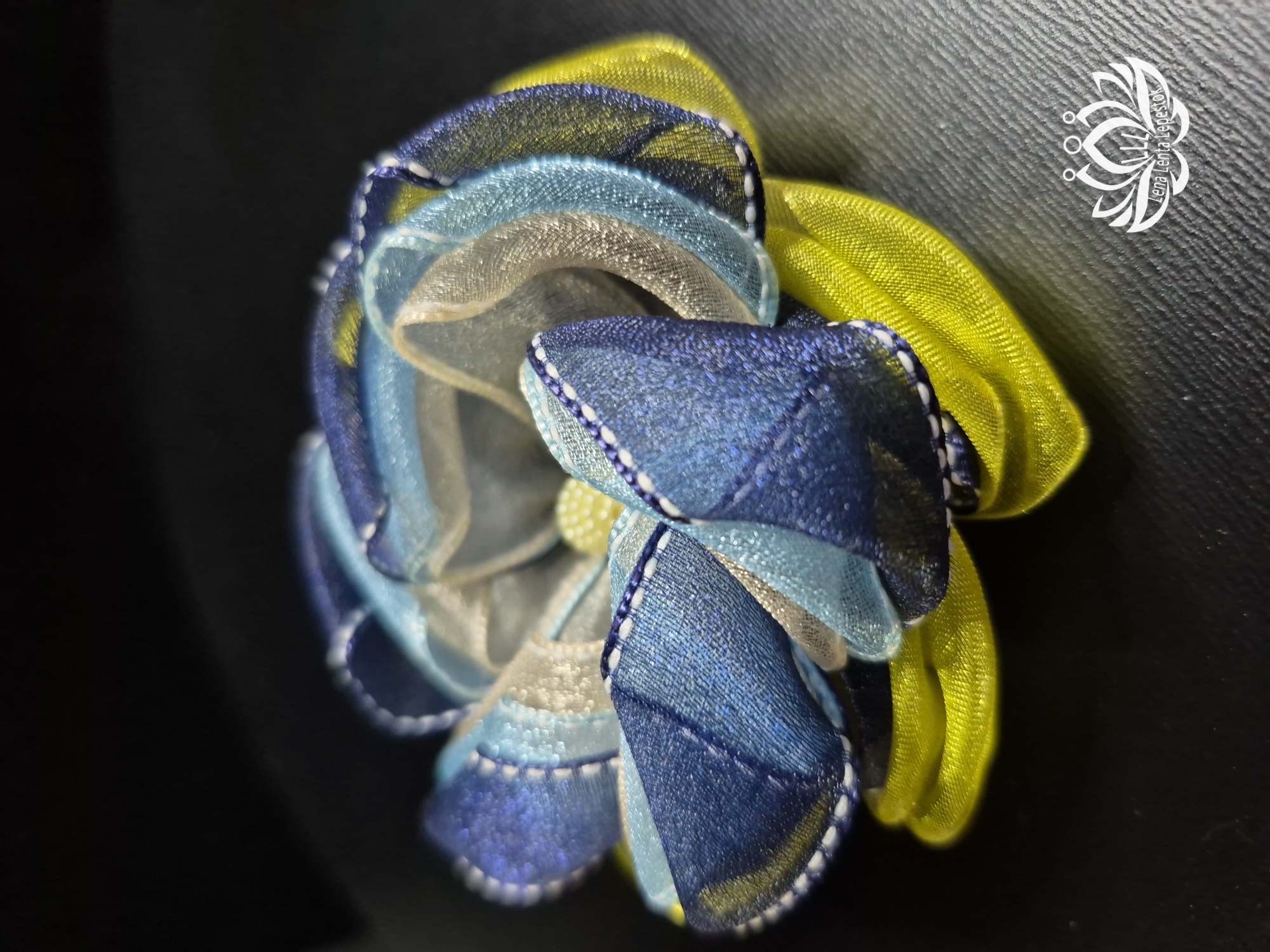 Представьте себе: талантливая волшебница Елена, вооружившись органзой трех оттенков лазури, наколдовала это чудо в технике Канзаши! Каждый лепесток дышит легкостью, каждый изгиб – само совершенство! Этот цветок не просто украшение, это портал в мир грез и сказочных преображений!