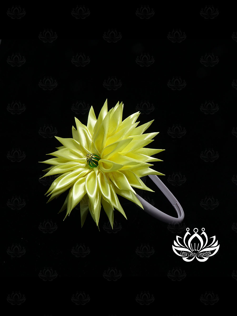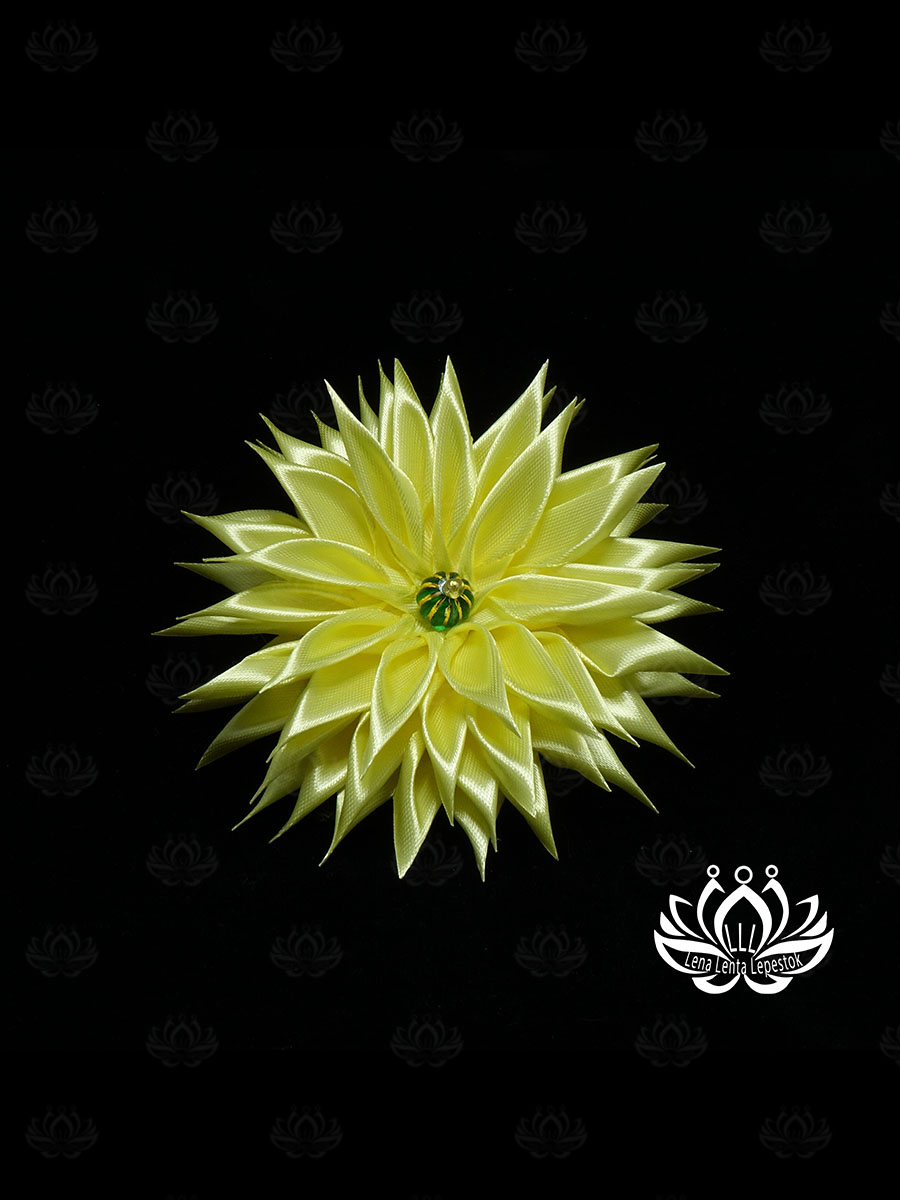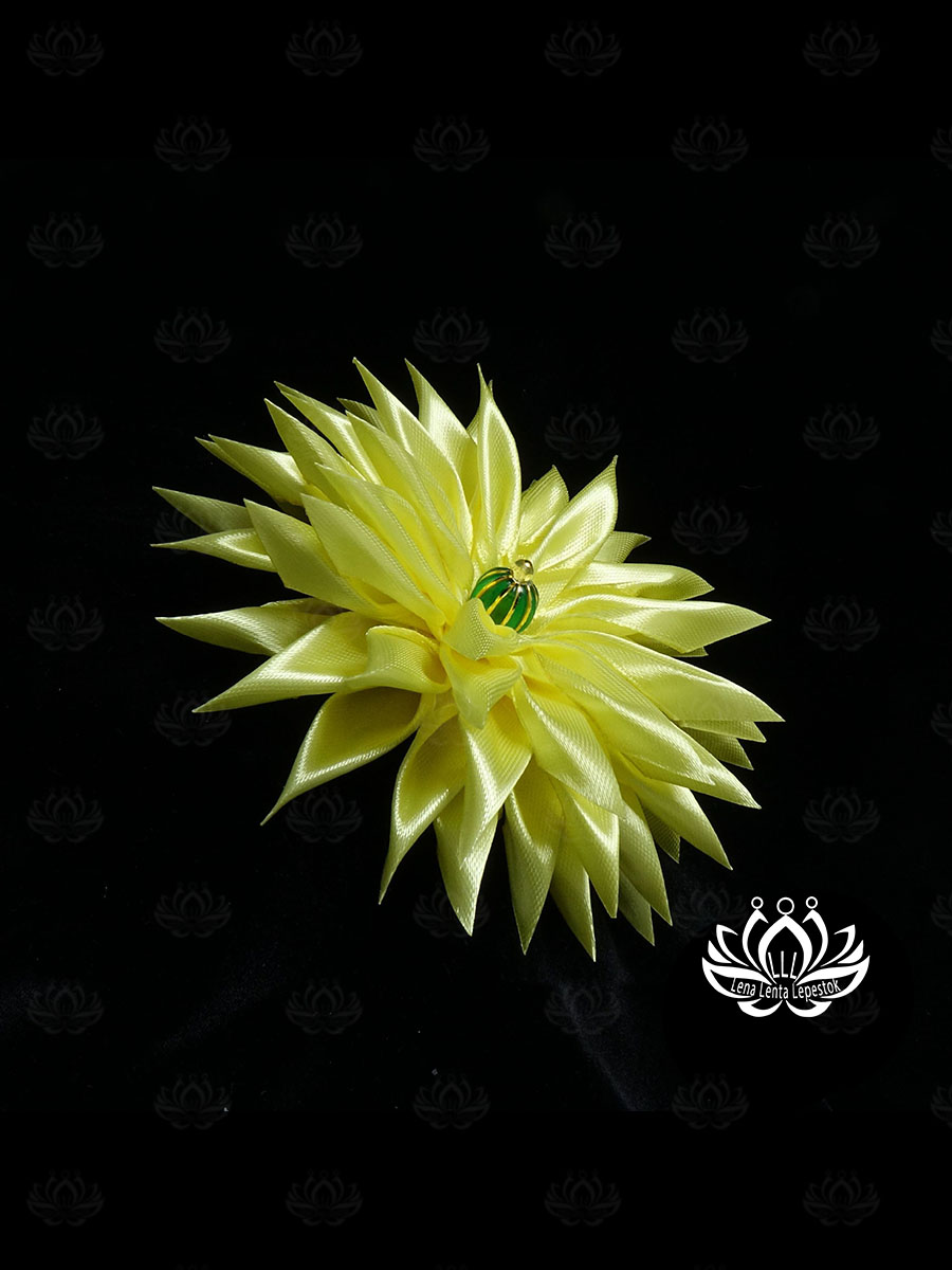 Погрузитесь в мир ярких эмоций и восхитительных образов с нашей уникальной заколкой "Георгин", выполненной в технике Канзаши. Этот великолепный цветок, созданный из 53 лепестков атласной ленты светло-желтого цвета, станет настоящим акцентом вашего стиля, добавляя яркости и романтики в любое ваше мероприятие.