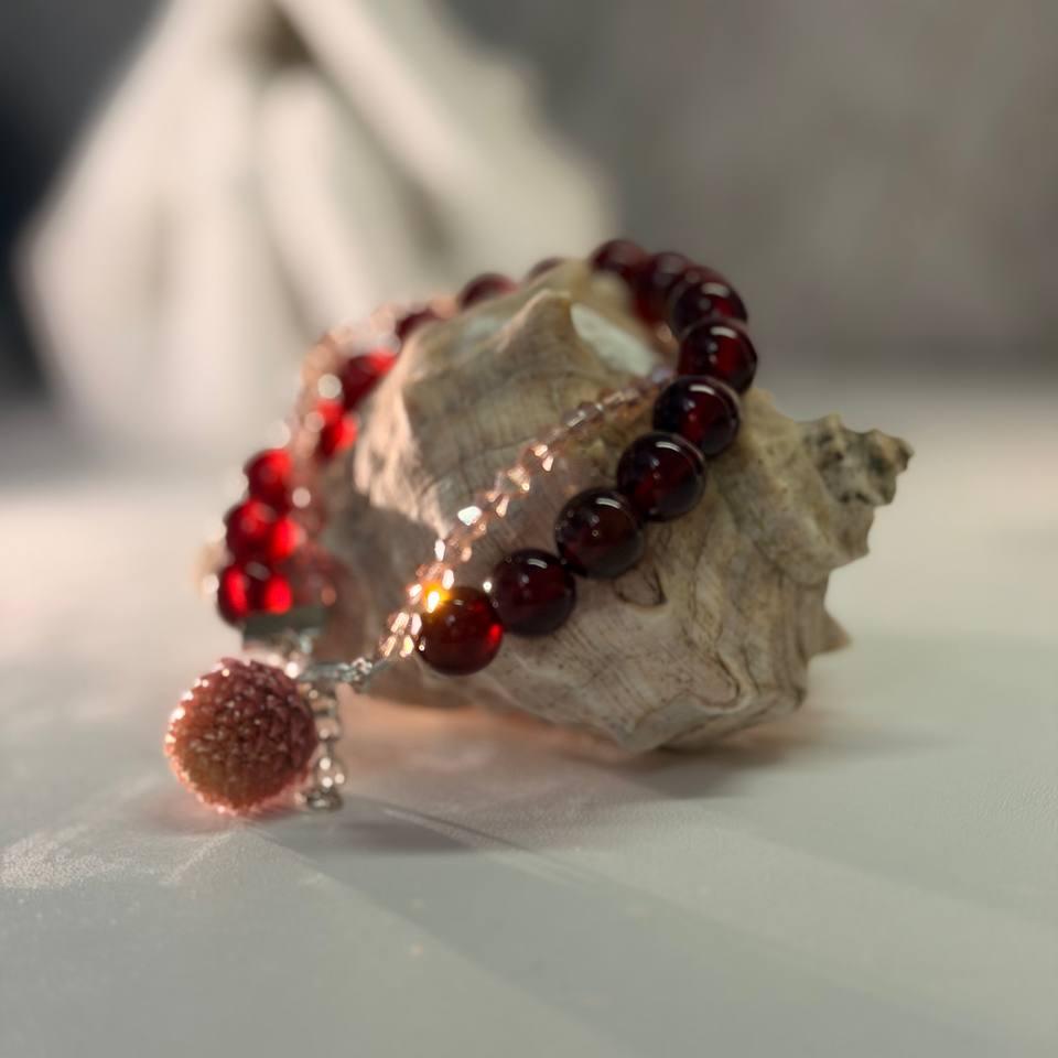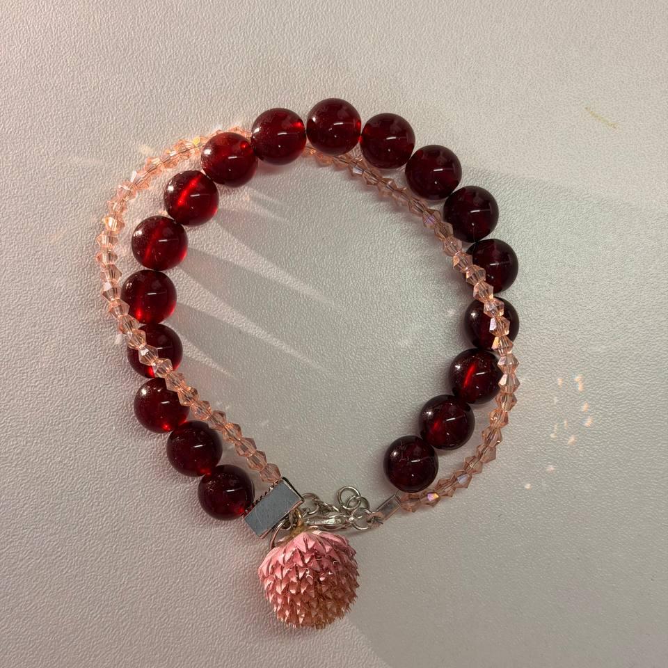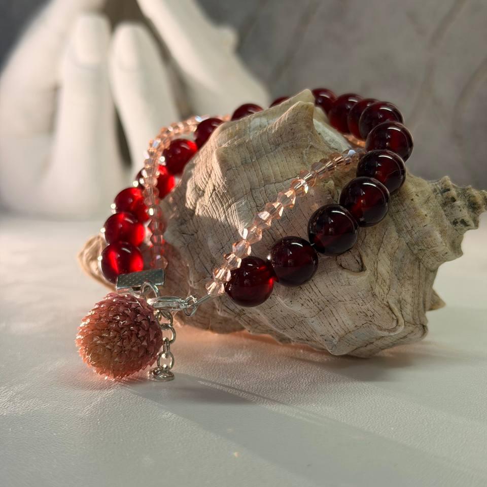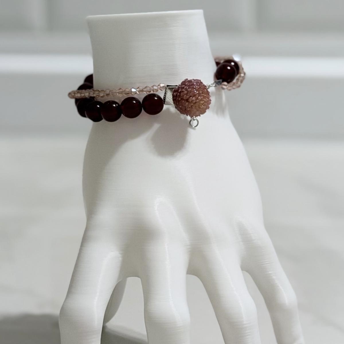 Бархатные бордовые капли, усыпанные розовым мерцанием хрустальных бусин - браслет, в котором встречаются страсть и нежность.