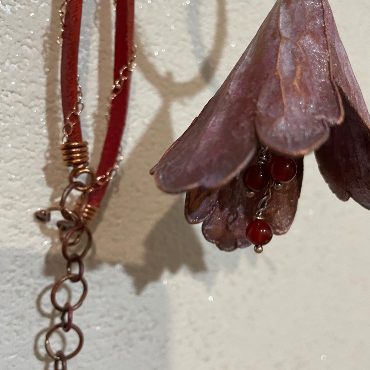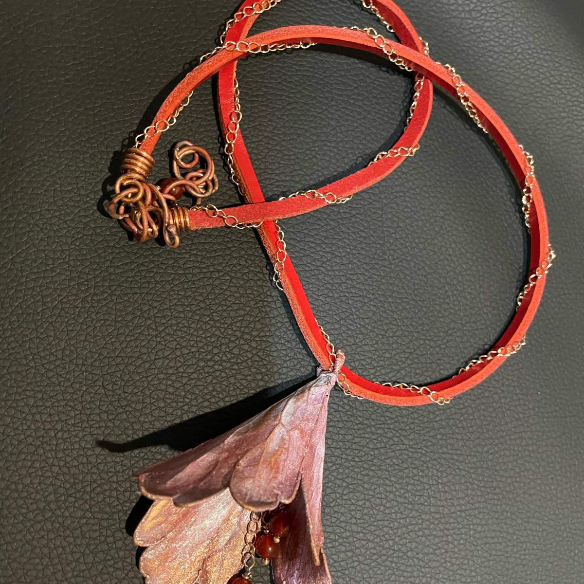 Кулон «Колокольчик любви», сделанный из листа пиона, омеднен красной медью и покрыт сложной патиной.