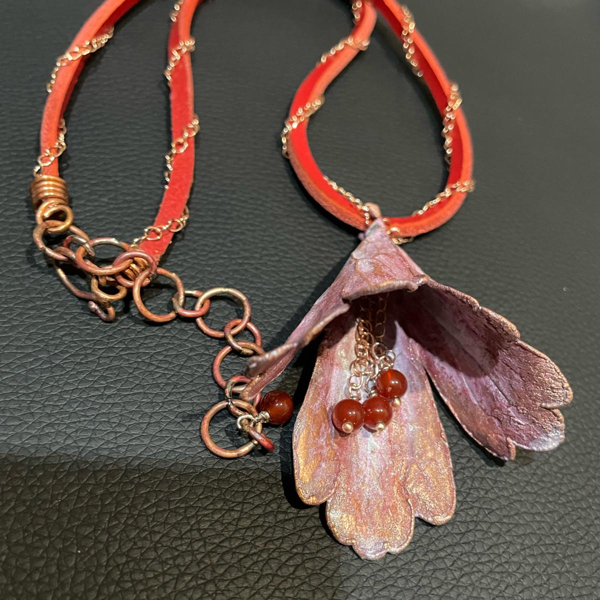 Кулон «Колокольчик любви», сделанный из листа пиона, омеднен красной медью и покрыт сложной патиной.