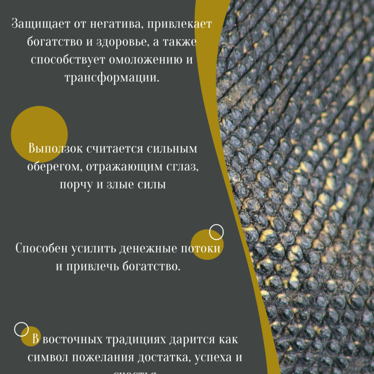 Выползок способен усилить денежные потоки и привлечь достаток. Способствует омоложению и трансформации.
