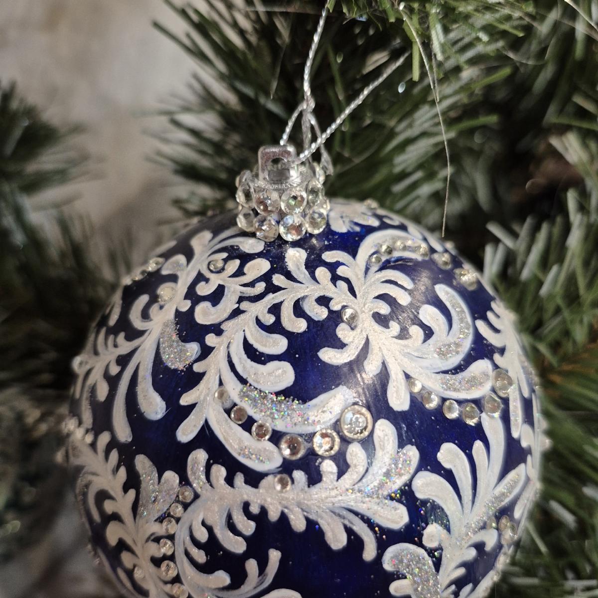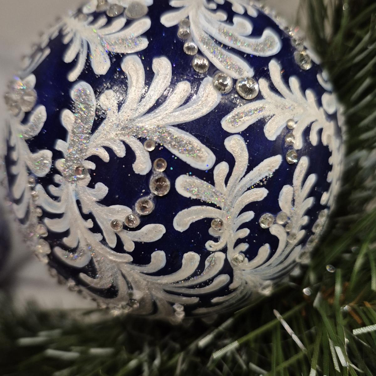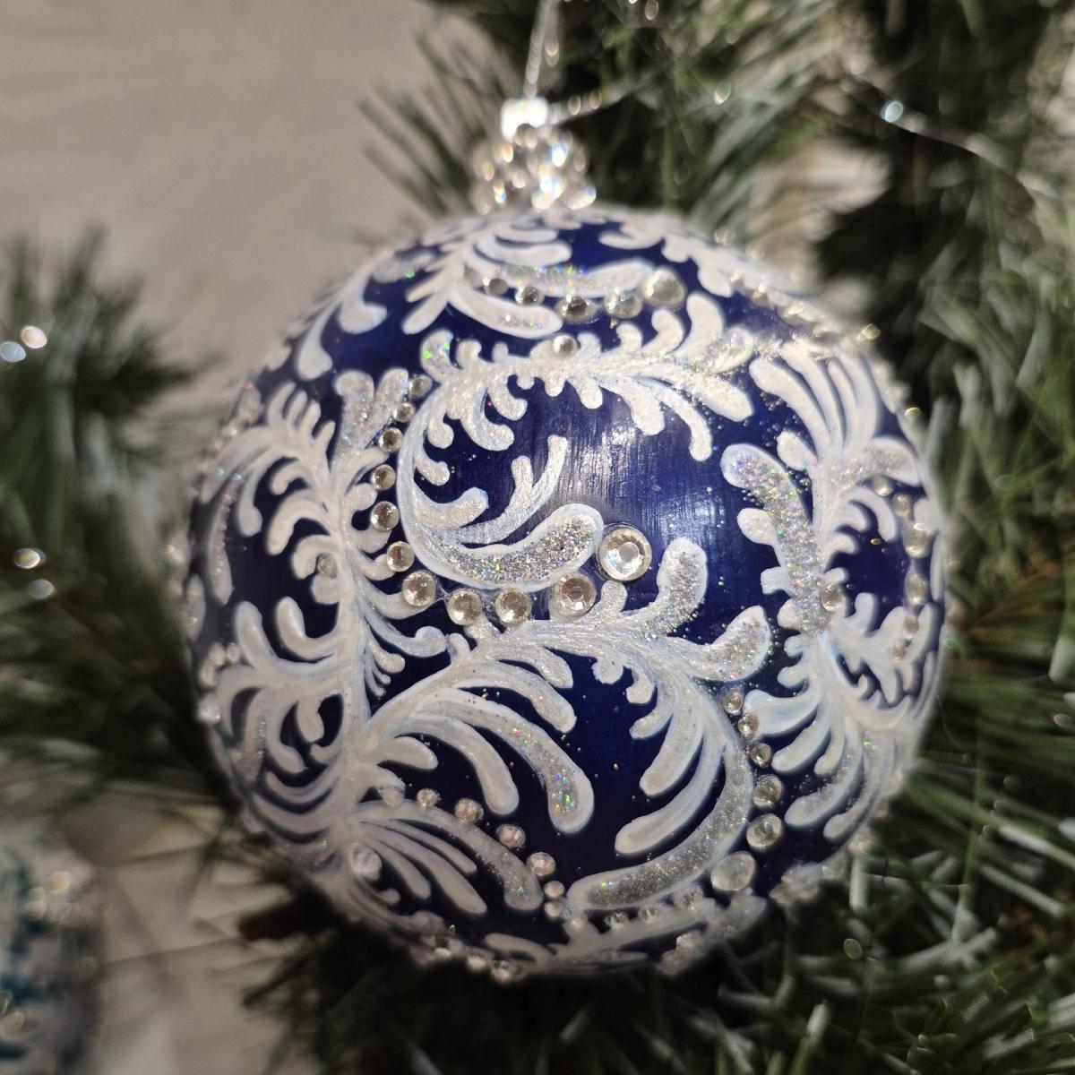 Новогодний шар, ёлочное украшение, ручная работа, авторская роспись, пластик, d-10 см., синий, краски-гуашь, акрил, покрытие-фикс-актив, акриловый лак, глиттер, стразы.