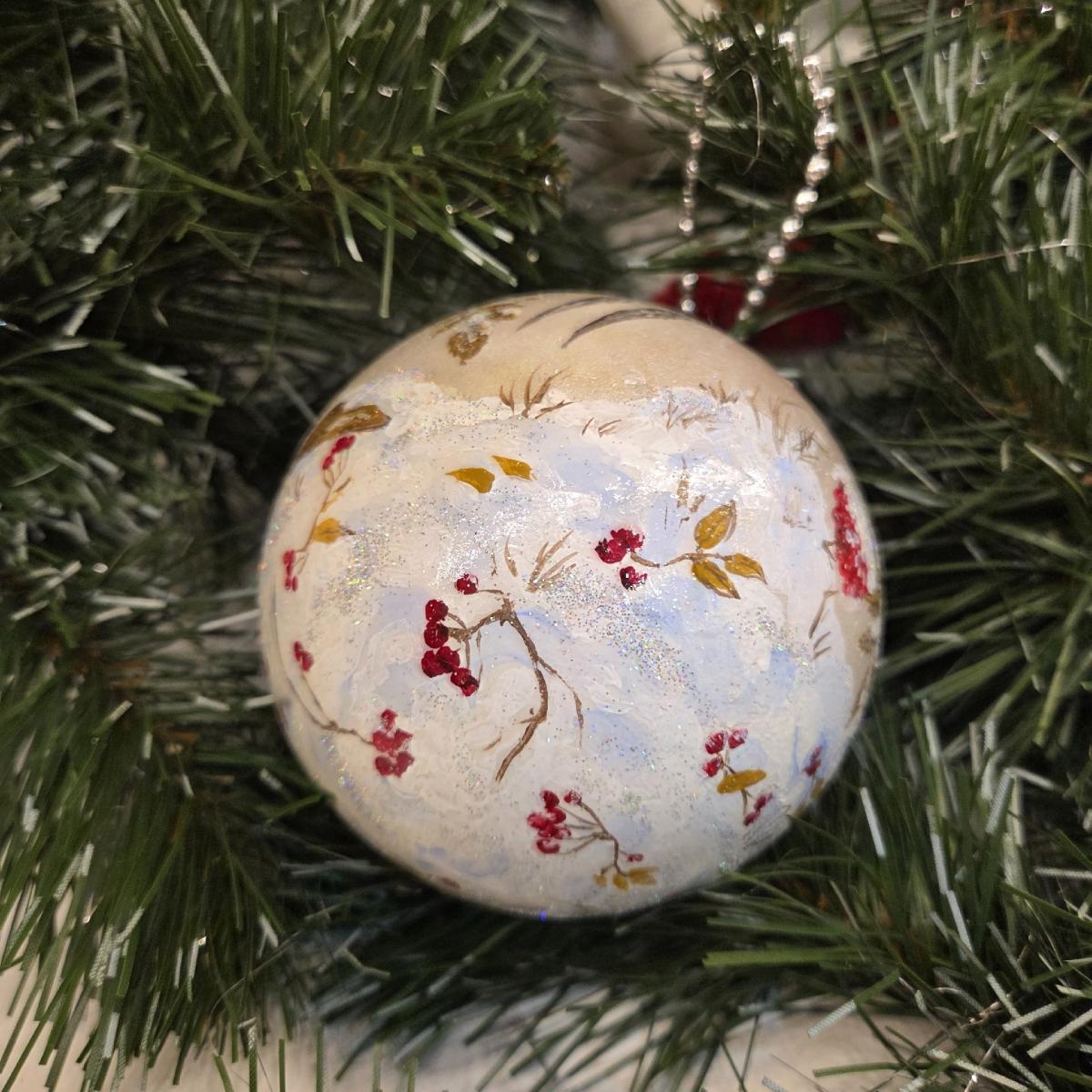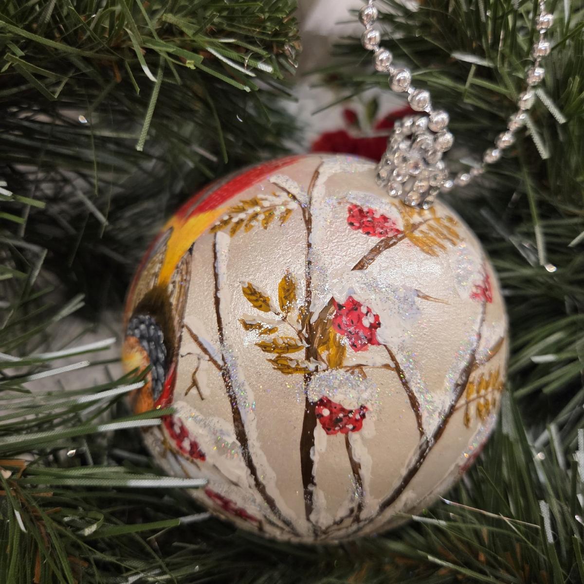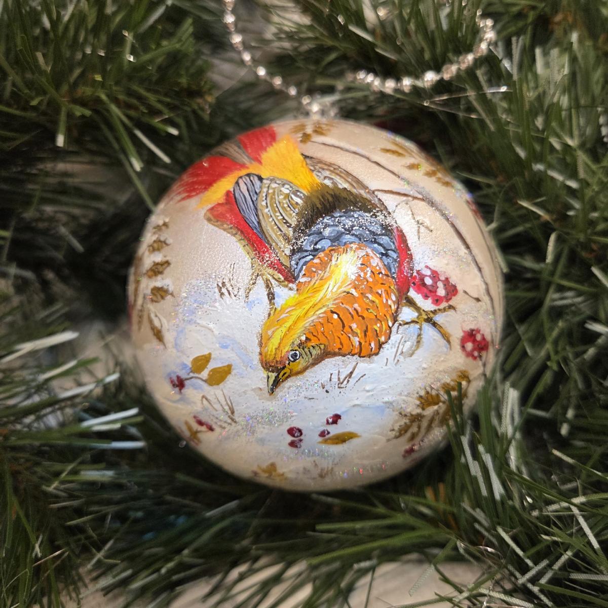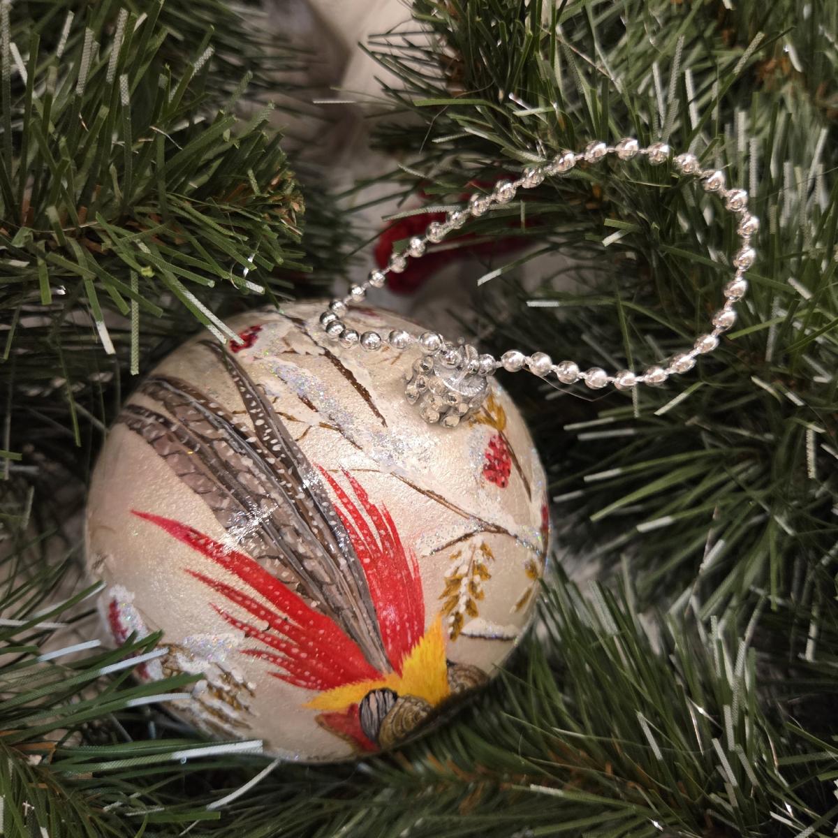 Новогодний шарик ручной работы с авторской росписью "Фазаны"(не декупаж). Оригинальное украшение в единственном экземпляре. Красивый подарок к Новому Году и Рождеству. Ярко и эффектно смотрится при искусственном освещении. Украшение стразами и глиттером. Шар пластиковый, даже если упадет, то не разобьется. Диаметр 10 см. Краски акрил. Покрыт глянцевым лаком.