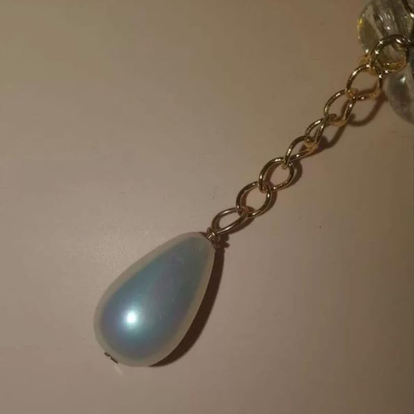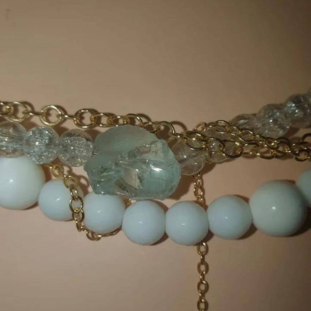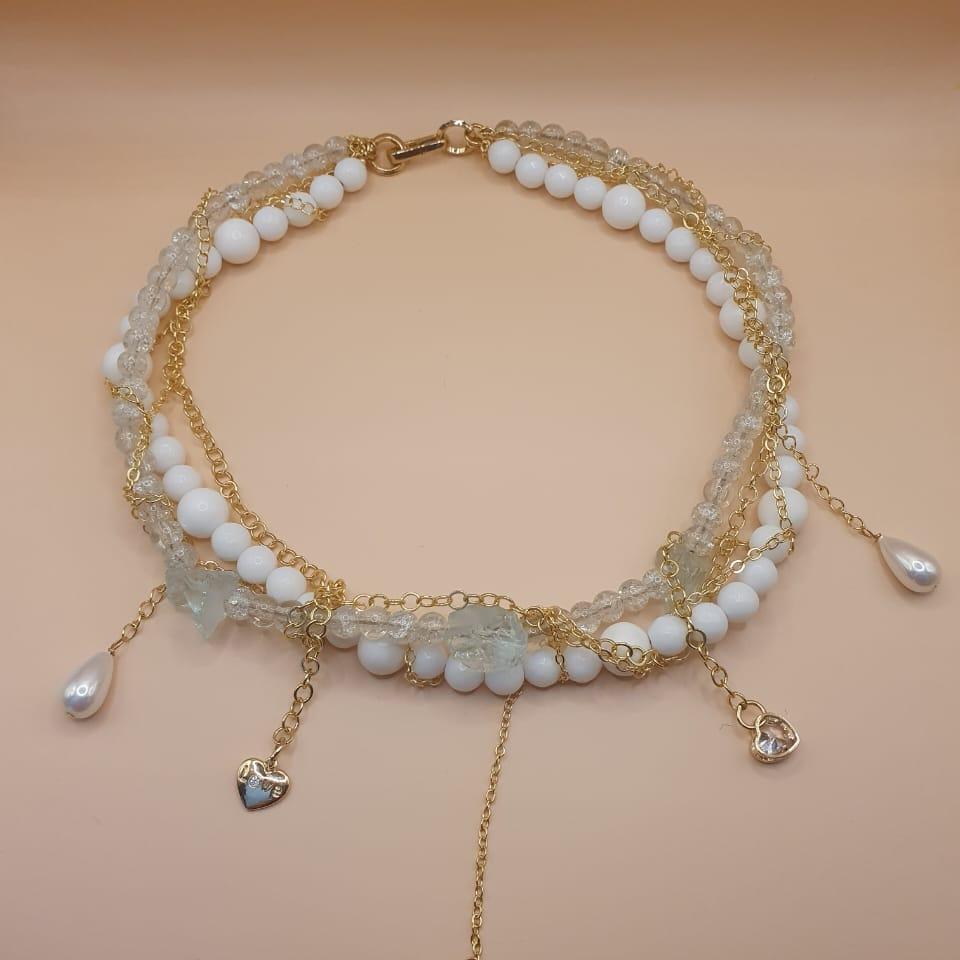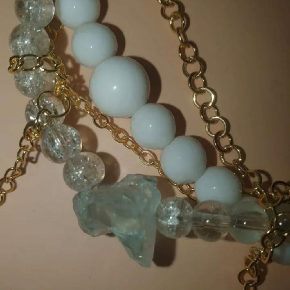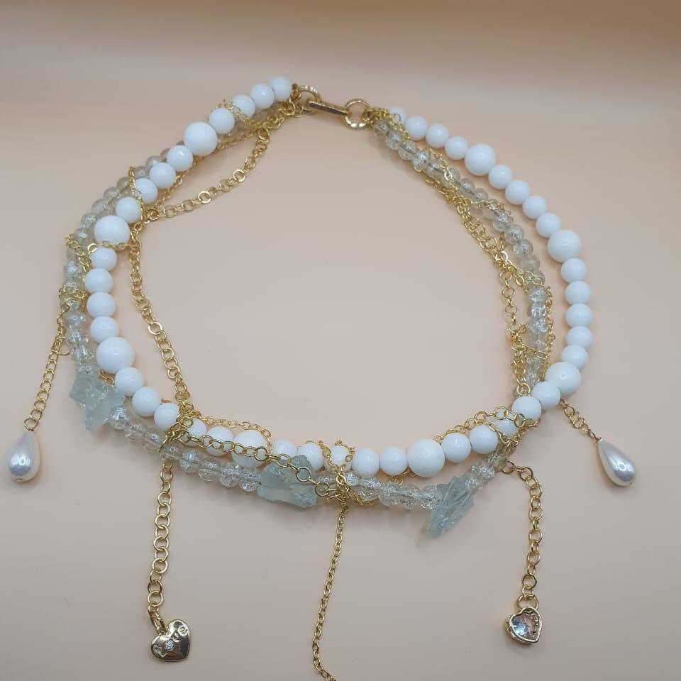 Украшение на шею из полудрагоценных камней, дикие бусины аквакварца, жемчуг натуральный, кристалл Swarovski, белые бусины из ракушки, бусины прозрачные каменного кварца, итальянская фурнитура позолота 14 карат, ручная работа, длина изделия 42 см.