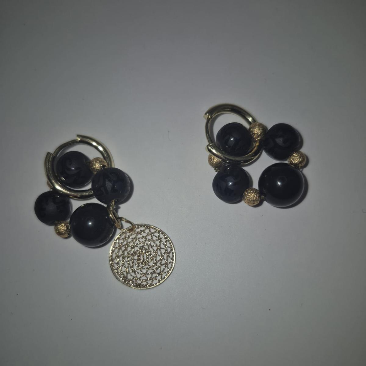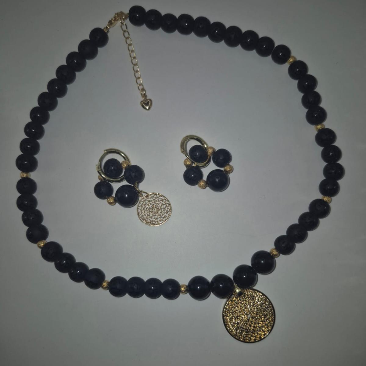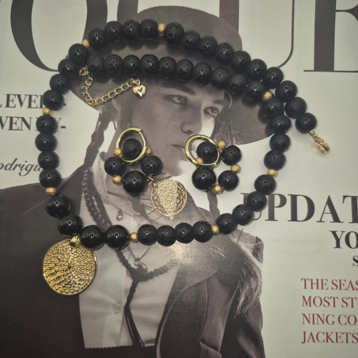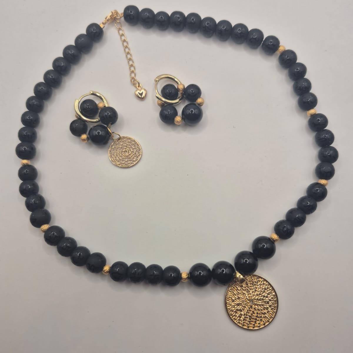 Комплект украшений из матового чёрного агата, итальянская фурнитура - позолота 14 карат. Кулон круглый на чокере и подвеска на одной серьге - позолота 14 карат.