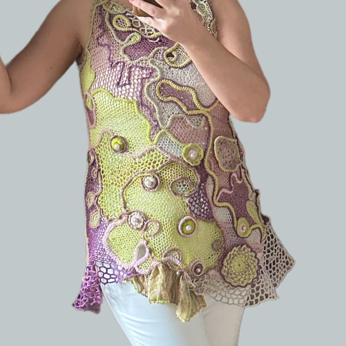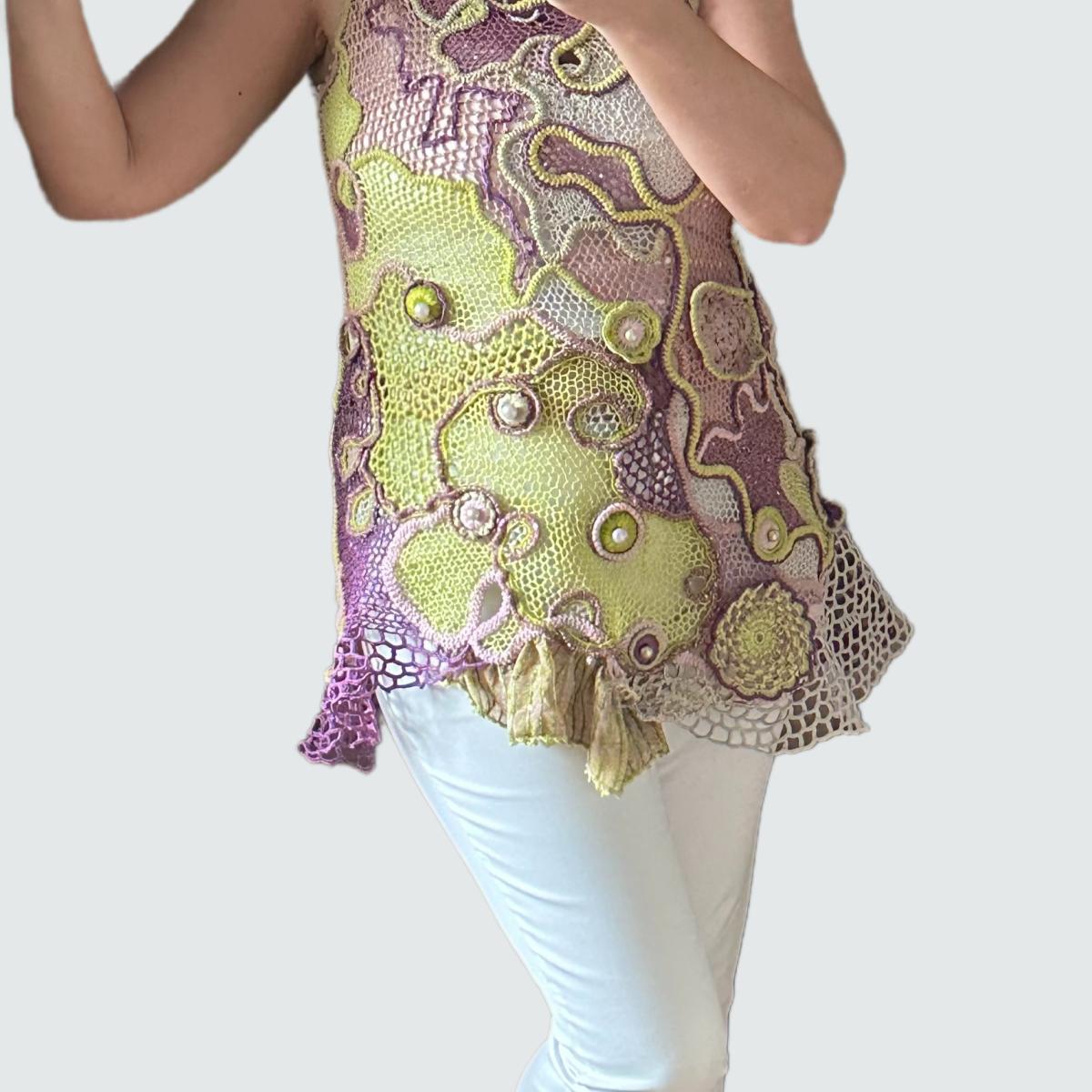 Каждая петелька создана с любовью и вниманием к деталям, используя исключительно натуральные материалы: шёлк, хлопок, лён и итальянскую вискозу. Эта туника – единственный экземпляр, который подчеркнёт вашу индивидуальность и неповторимый стиль.