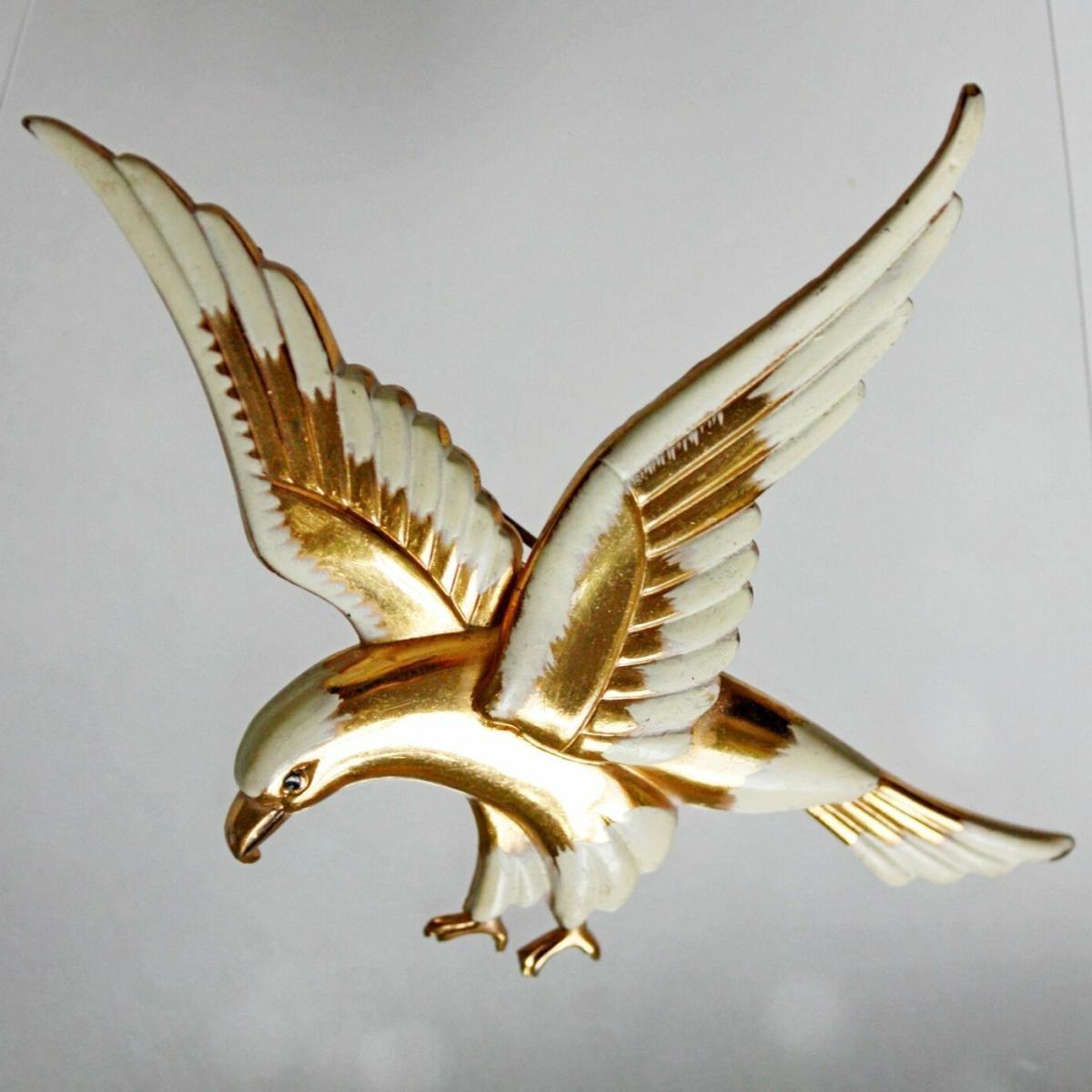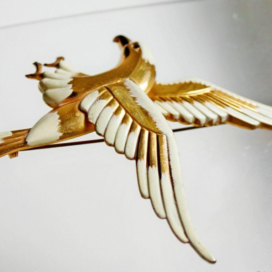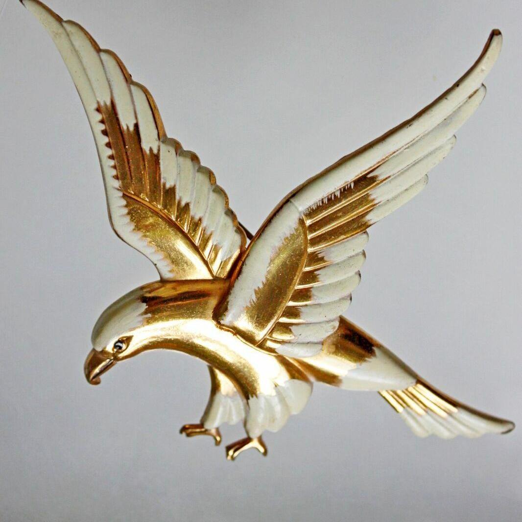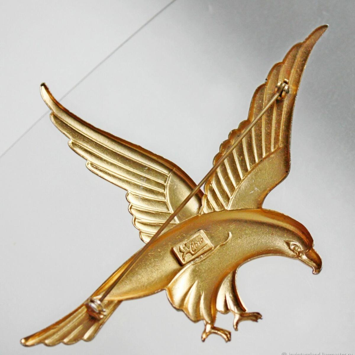 Коллекционная брошь от компании Coro. Выполнена в самом редком ее варианте, с позолотой и эмалью. Маркирована pegasus coro, маркировкой, которая использовалась с 1945-го года, по самое начало 1950-х. Брошь очень крупная, средней тяжести. Отличное состояние.