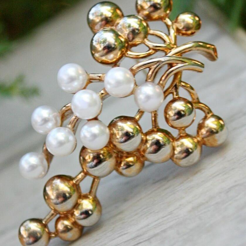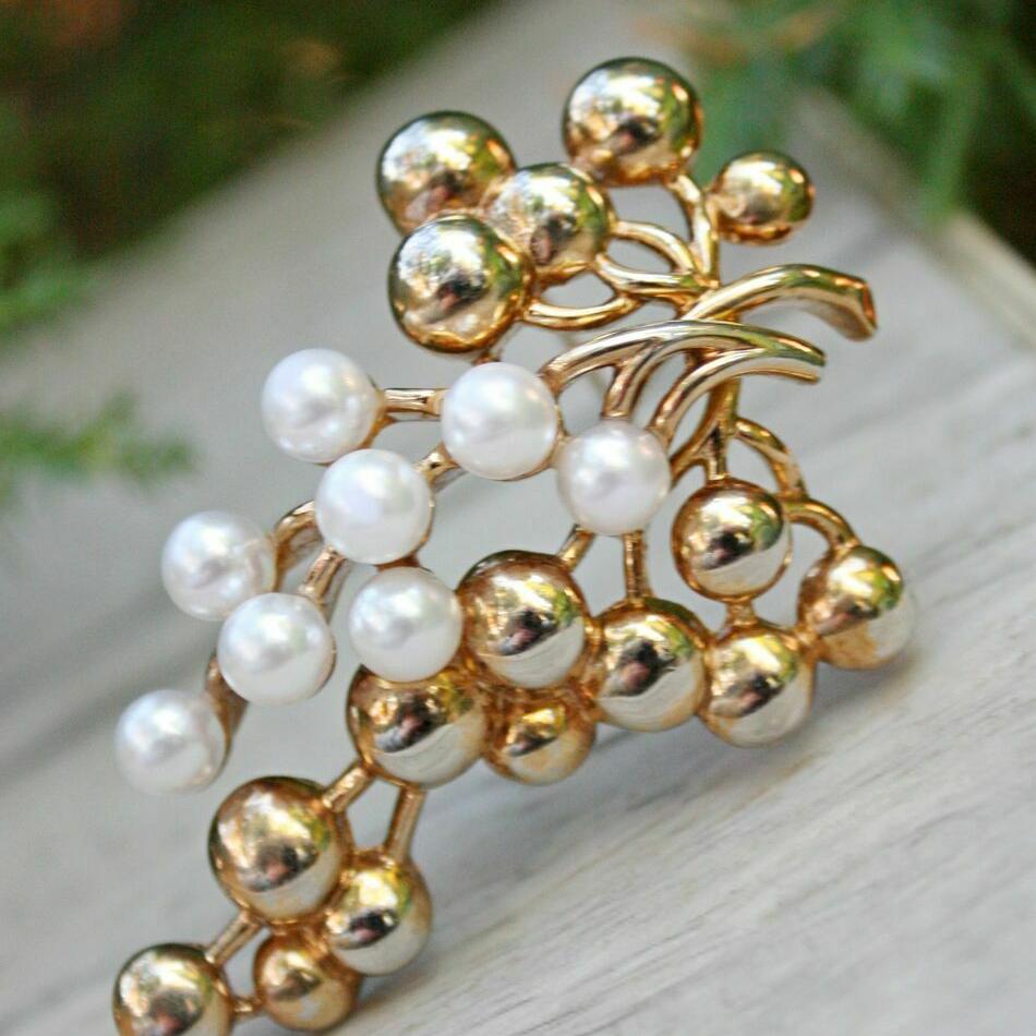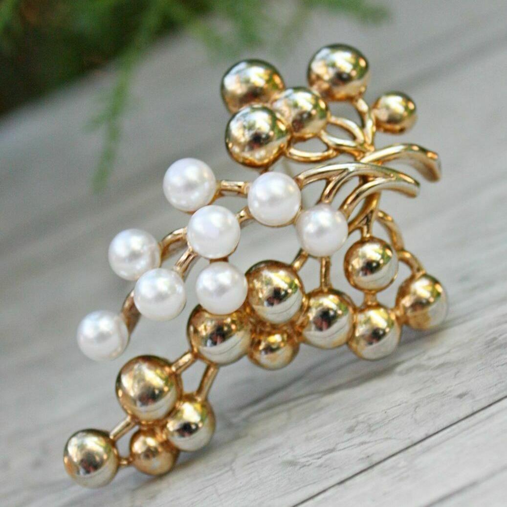 Редкая, коллекционная брошь 1940-х годов, от компании Trifari. Изготовлена из ювелирного сплава. позолоты и искусственного жемчуга. Брошь из плотного сплава, с небольшим объемом и не очень легкая. Маркирована. Отличное винтажное состояние.