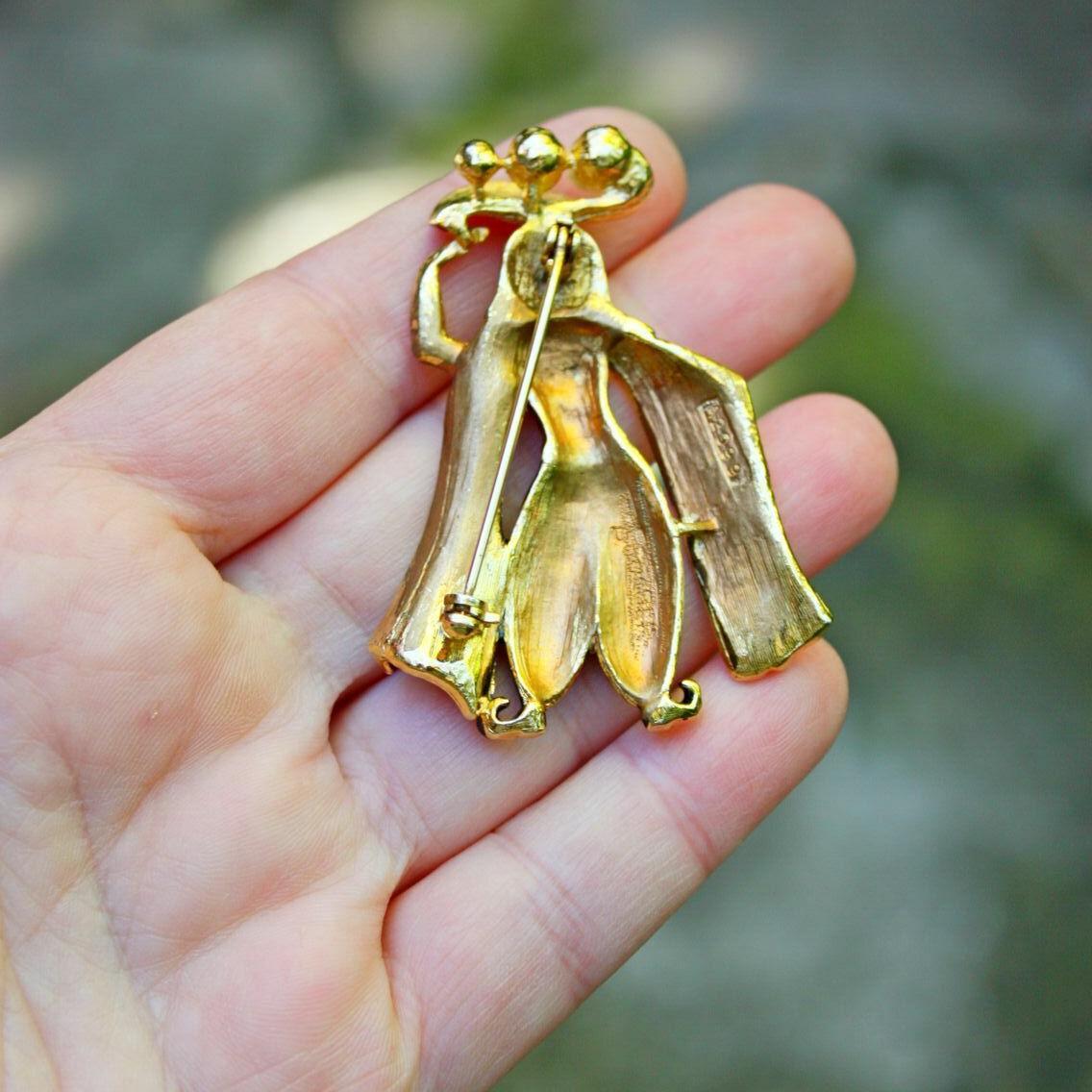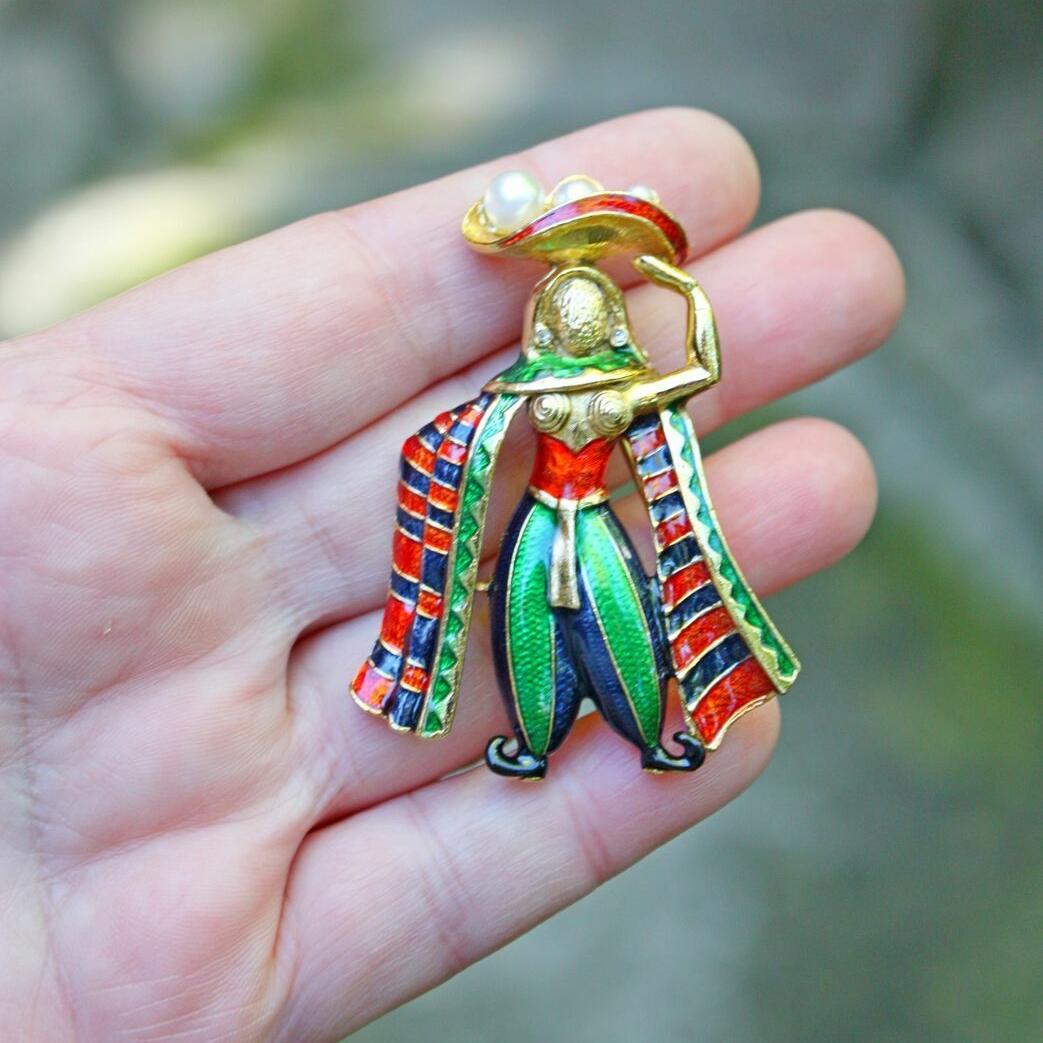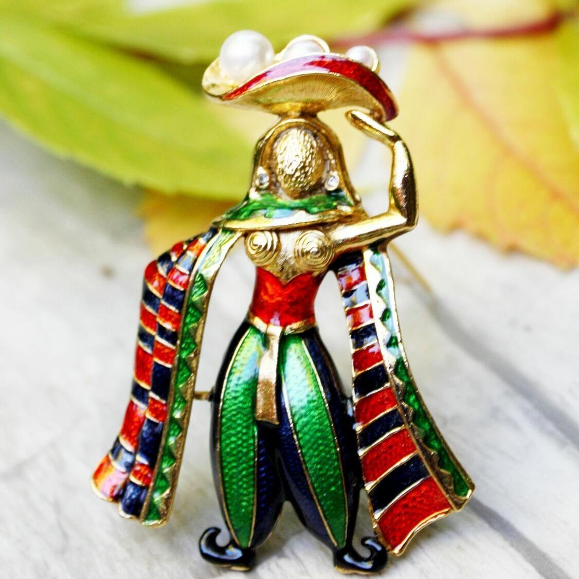 Коллекционная брошь 1970-х годов, от компании Sphinx. Украшение яркое и объемное, изготовлено из ювелирного сплава золотого тона, "перегородчатой" эмали, стразов и искусственного жемчуга. Маркирована литерой и номером дизайна 2099. Отличное состояние.