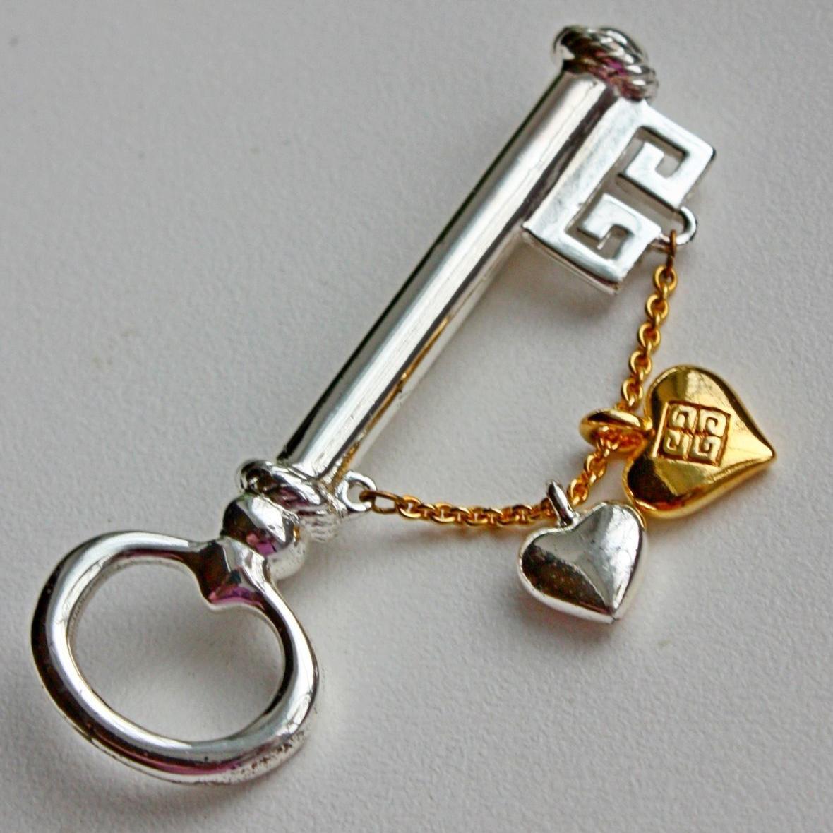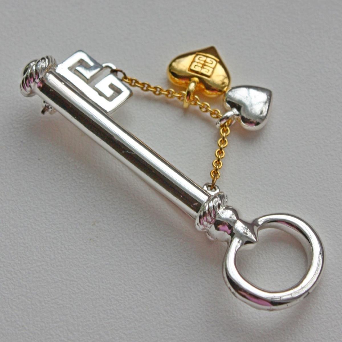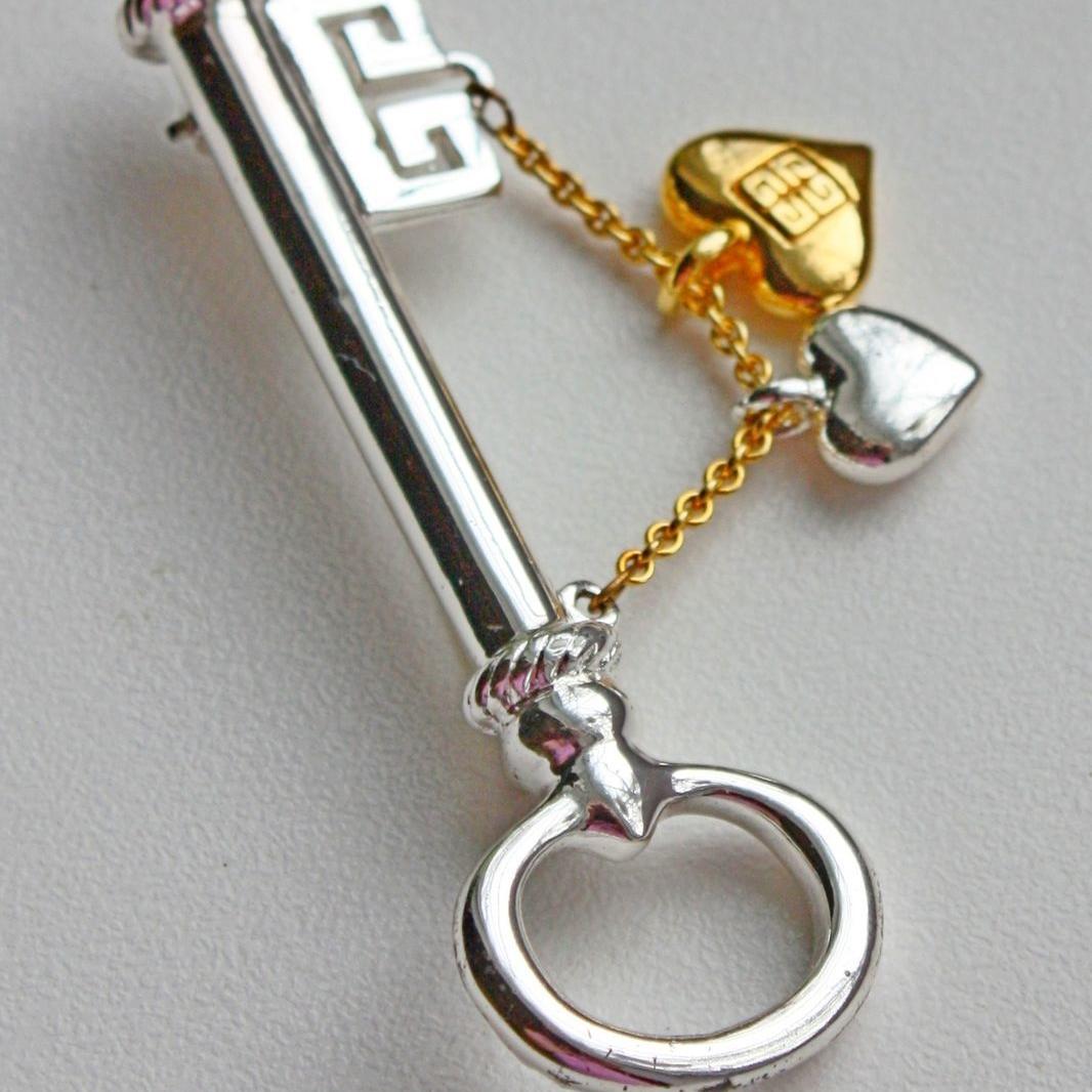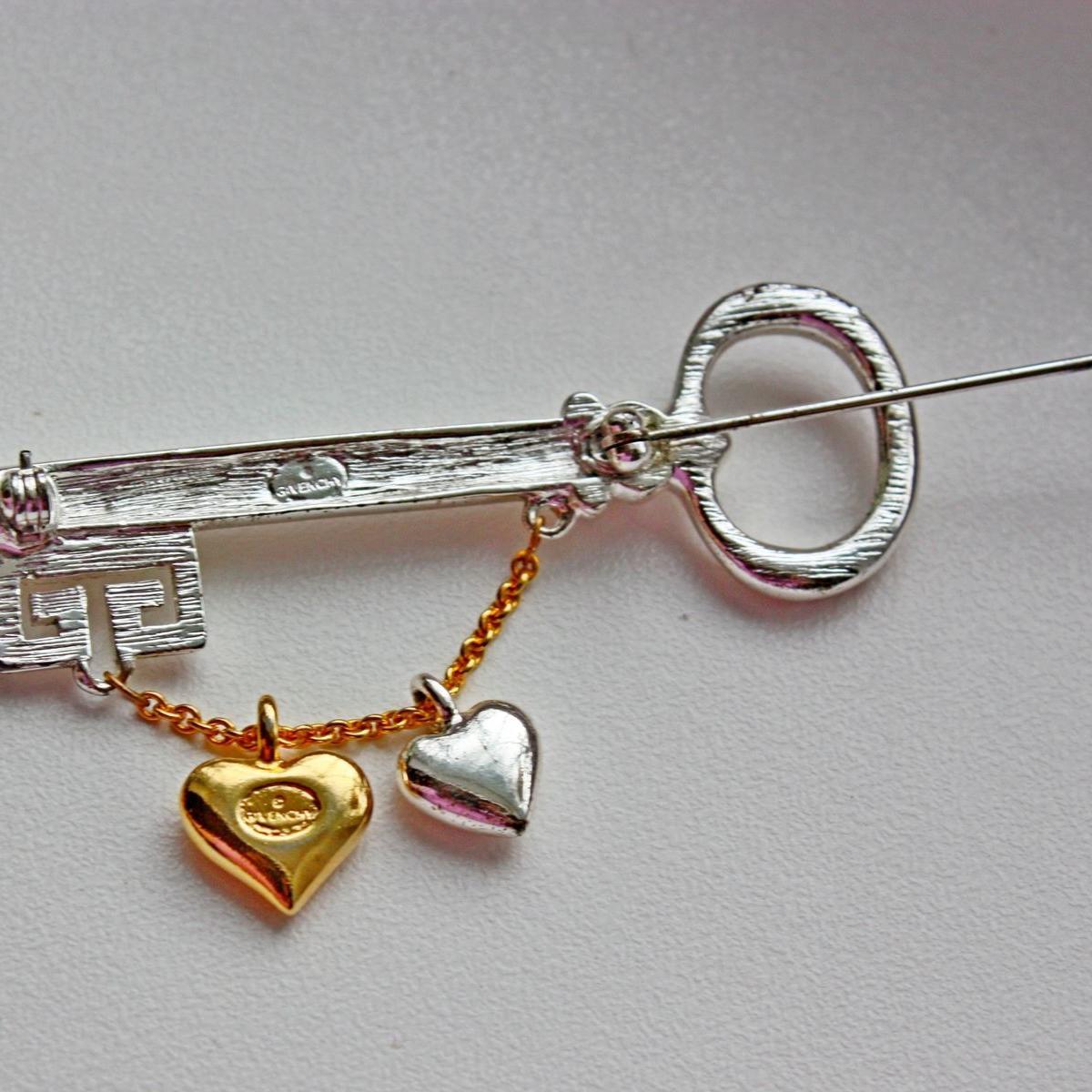 Редкая, коллекционная, очень романтичная брошь от Givenchy. Изготовлена из ювелирного сплава с родиевым покрытием и позолотой. Брошь крупная и довольно тяжелая. Маркирована на ключе, и с двух сторон на золотом сердечке. Отличное состояние, все тени - блики от фотоаппарата.