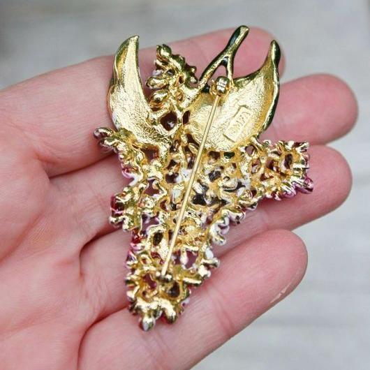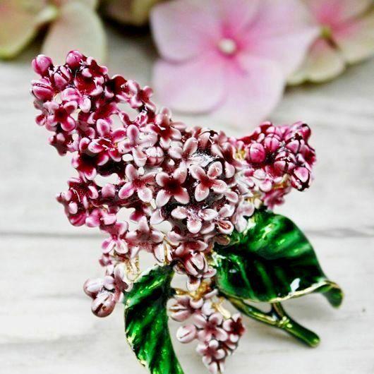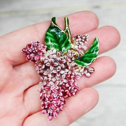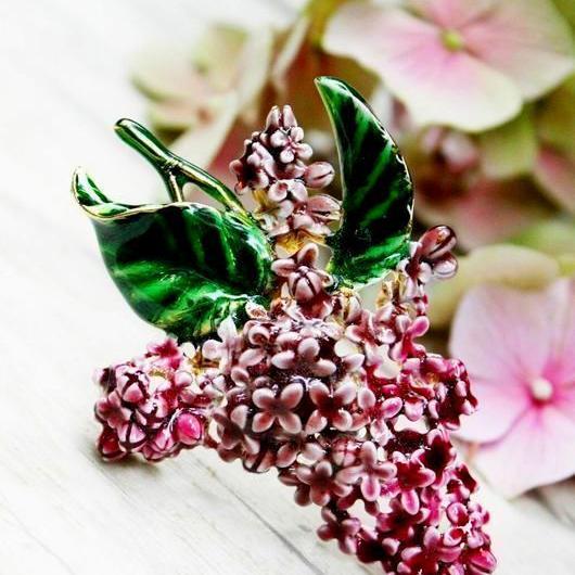 Очень красивая, роскошная сирень, изготовленная в 1980-х годах, в художественных мастерских MFA (Museum of Fine Arts). Произведена из ювелирного сплава, позолоты и эмали. Полностью ручная работа. Брошь довольно крупная, тяжелая, с объемом. Маркирована. Отличное состояние.