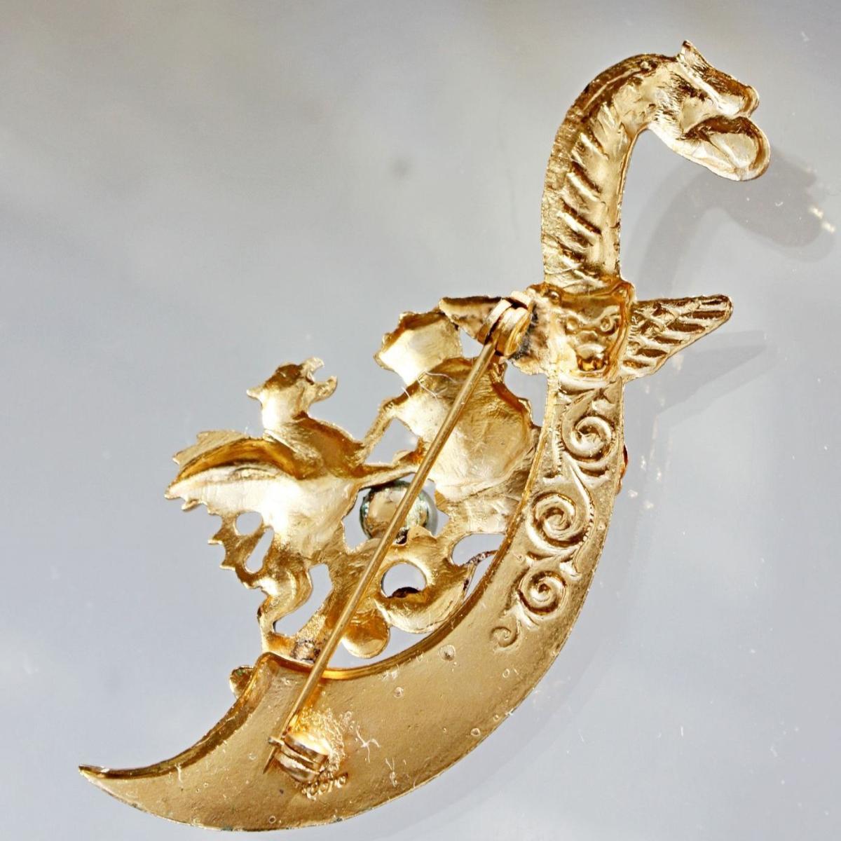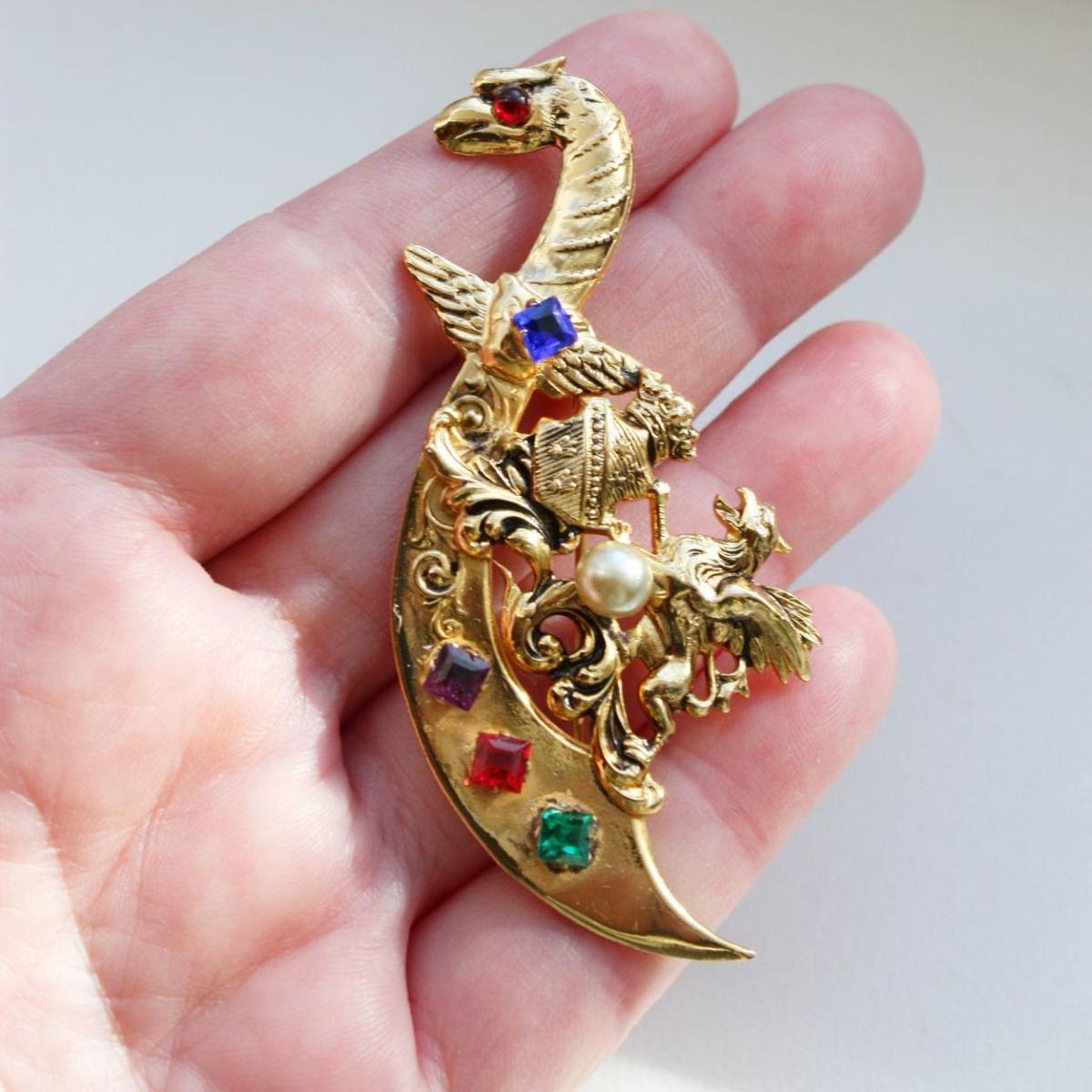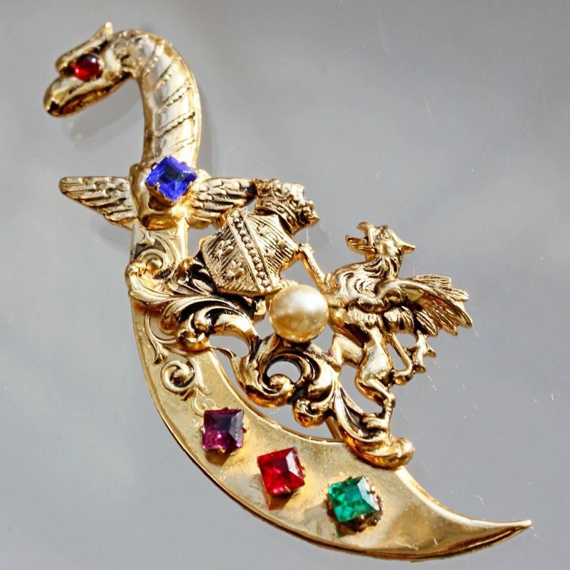 Очень редкая брошь 1940-х годов, от компании Coro. Изготовлена из ювелирного сплава, позолоты, люцита, искусственного жемчуга и кристаллов Сваровски. Брошь крупная, но не очень тяжелая. Маркирована. Отличное винтажное состояние. Есть небольшое потемнение на обратной стороне броши у застежки. Это трудно заметить, и не влияет на общую красоту украшения.