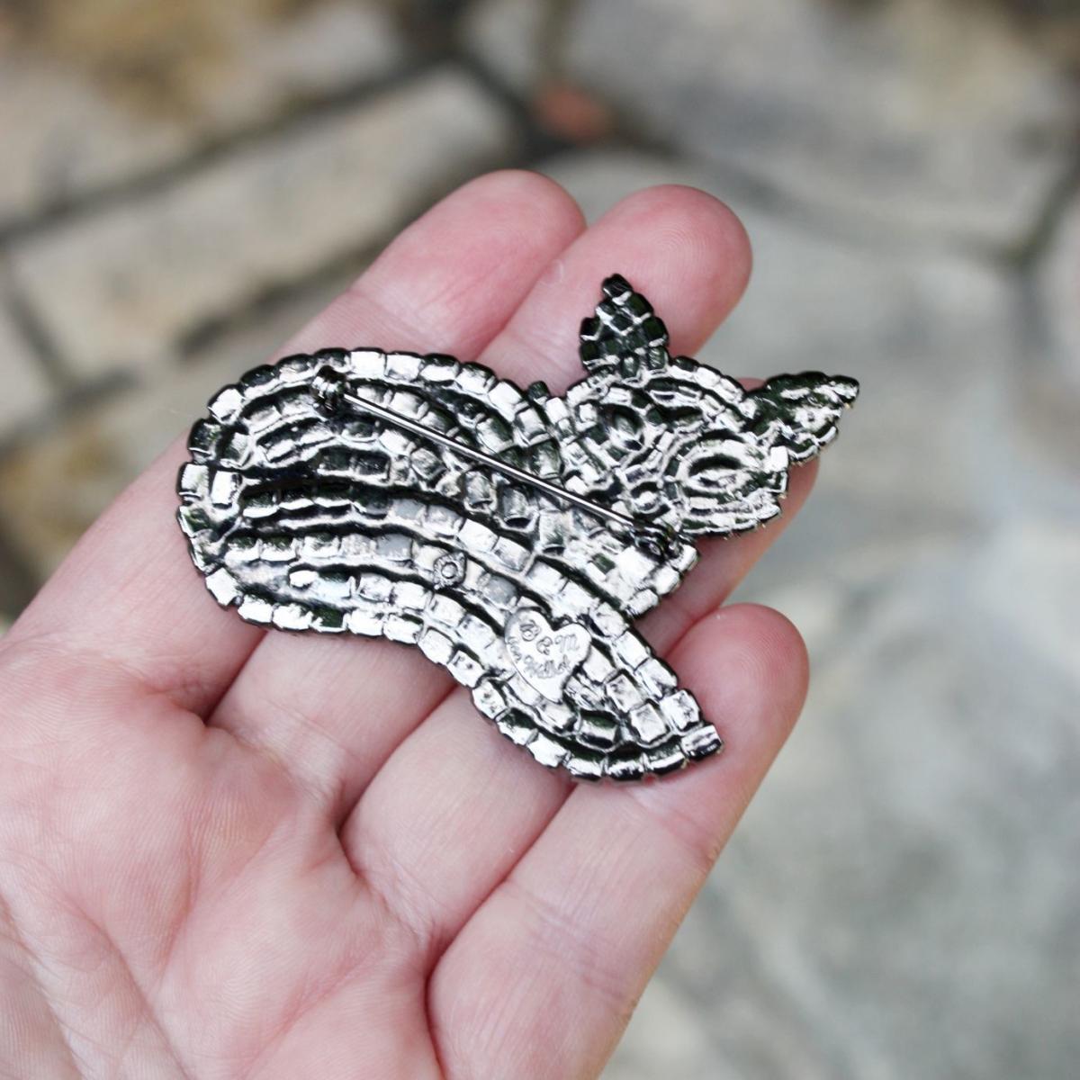 Необычная, коллекционная брошь от Bettina Von Walhof. Изготовлена из ювелирного сплава, гематитового покрытия и кристаллов Сваровски. Брошь смотрится очень эффектно и меняет интенсивность окраски, в зависимости от освещения. Свои украшения, дизайнеры производили с начала 1990-х, по середину 2000 - х годов. Несмотря на то, что это сравнительно молодой возраст для винтажа, украшения Von Walhoff, занесены во многие каталоги винтажных украшений ( Pamela Wiggins "Costume Jewelry", Ann Mitchell Pitman "Inside the Jewelry Box"). Маркирована. Отличное состояние. Брошь довольно крупная и не очень легкая.