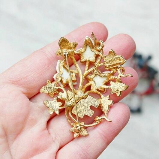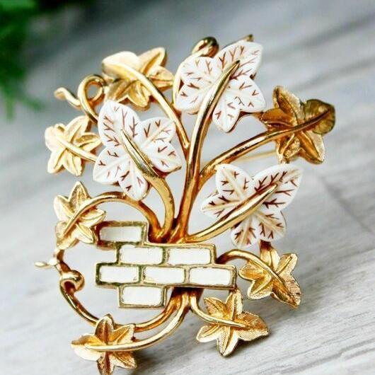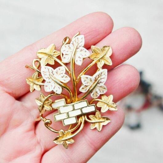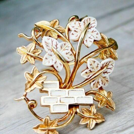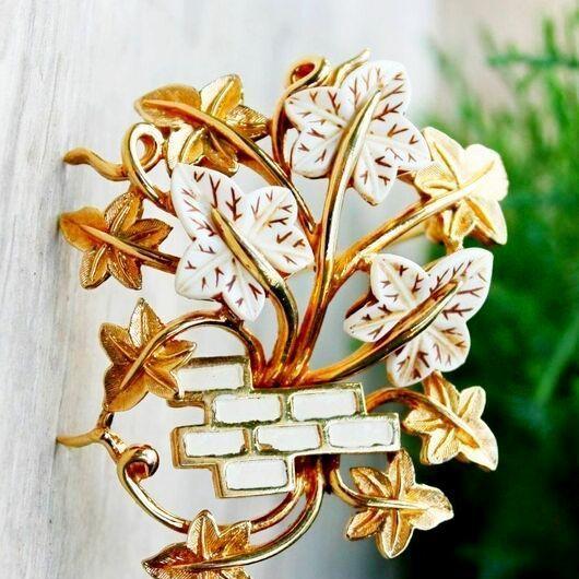 Редкая, коллекционная брошь от компании Marcel Boucher. Изготовлена из ювелирного сплава, позолоты, люцита и эмали. Брошь с объемом, цветок реалистично обвивает кирпичную стену, и украшение смотрится очень выразительно. Маркирована Boucher со знаком копирайта и номером 9063P, что говорит о дате производства этой броши с 1962-го по 1965-й год. Отличное винтажное состояние, золотой тон без изъянов. На одном кирпичике есть небольшая потертость эмали, но это больше заметно при увеличении. Все пятна на фото - блики.