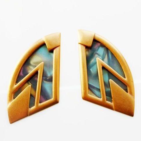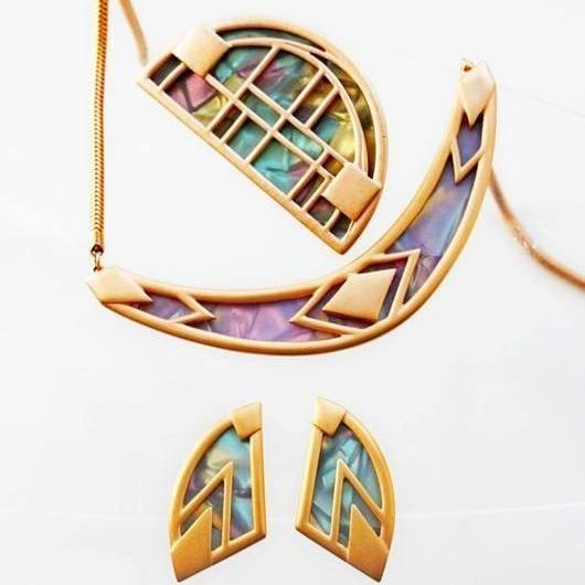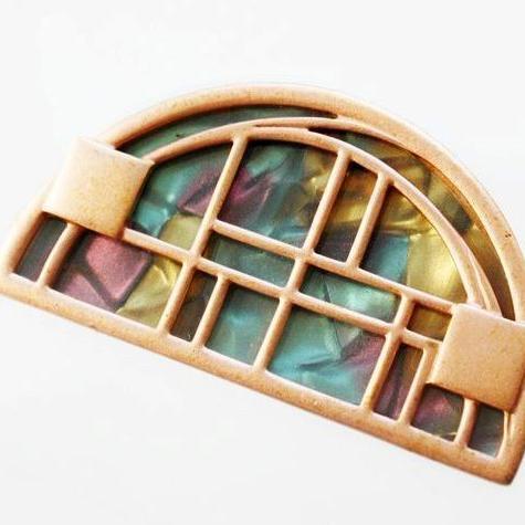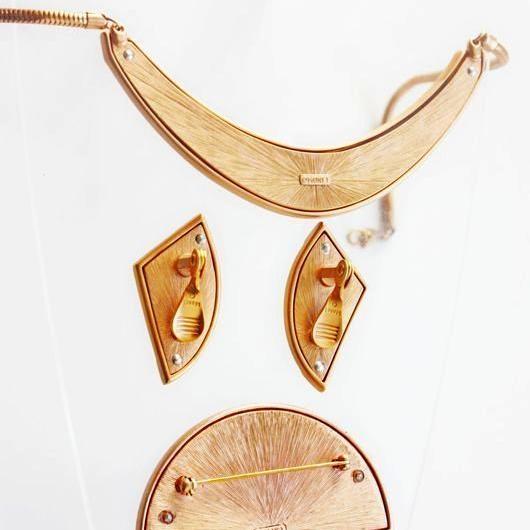 Очень необычный и редкий комплект ( колье - чокер, брошь и клипсы) 1960-х годов, от компании Monet. Изготовлен из ювелирного сплава светло-бронзового тона, и уникальной вставки из люцита. Люцитовая вставка красиво переливается цветом, в зависимости от освещения. Колье - чокерной длины 36 см. На колье стоит патентованная застежка компании Monet, маркированная Monet patening, позволяющая легко добавить стандартную цепочку - удлинитель. Маркирован полностью, Monet со знаком копирайта. Отличное состояние.