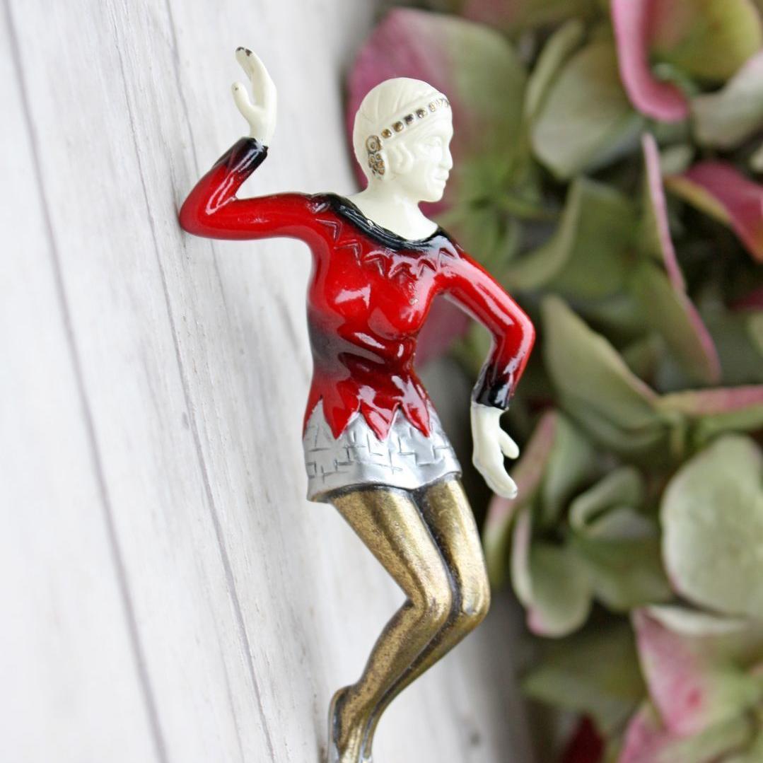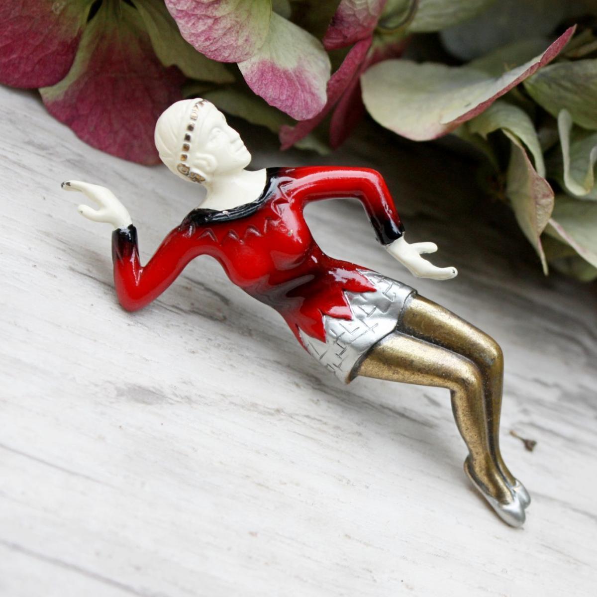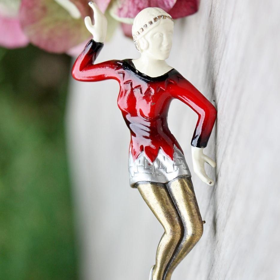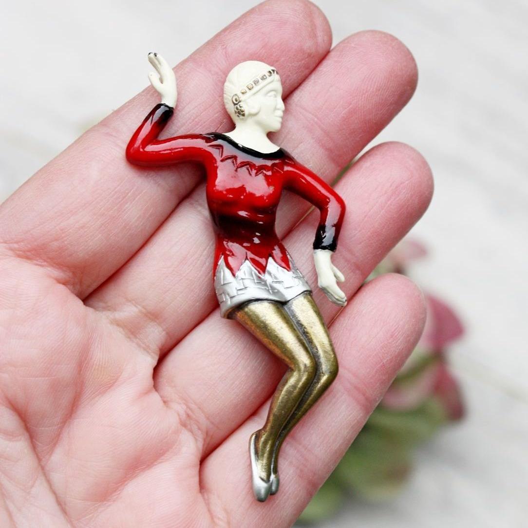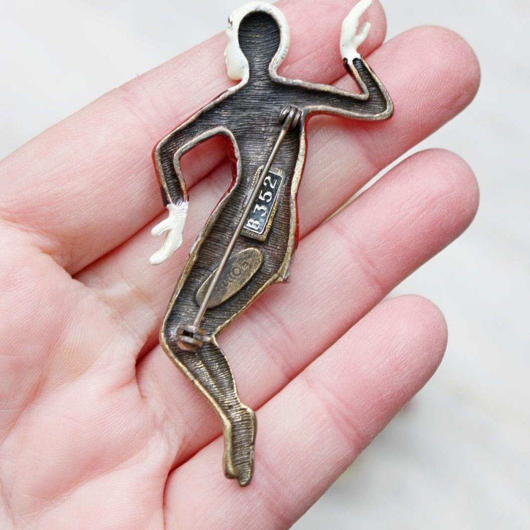 Редкая брошь 1980-х годов, от компании Art Deco 89. Прообразом броши, стали фигурки одного из самых знаменитых резчиков по слоновой кости начала 20- го века, Ferdinand Preiss. Именно он, впервые стал соединять слоновую кость с бронзовым литьем. Его женские фигурки, были очень популярны в 1920 -х - 1930 - х годах, и их популярность только выросла со временем. Брошь изготовлена из ювелирного сплава бронзового тона и эмали. Украшение крупное, с небольшим объемом. Маркирована Art Deco 89 и номером. Очень хорошее состояние. Есть незначительные потери эмали, два крошечных пятнышка на лифе платья и немного на кончиках пальцев.