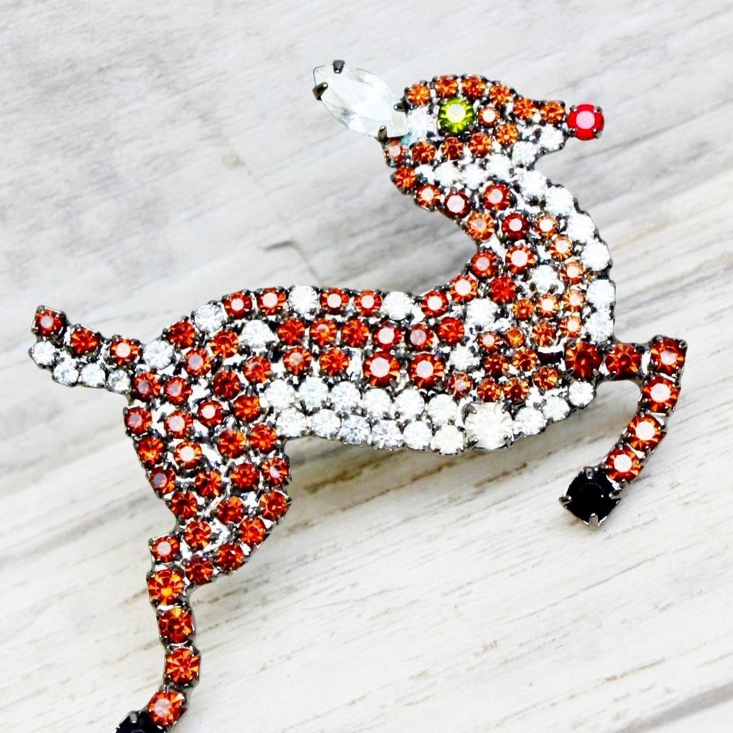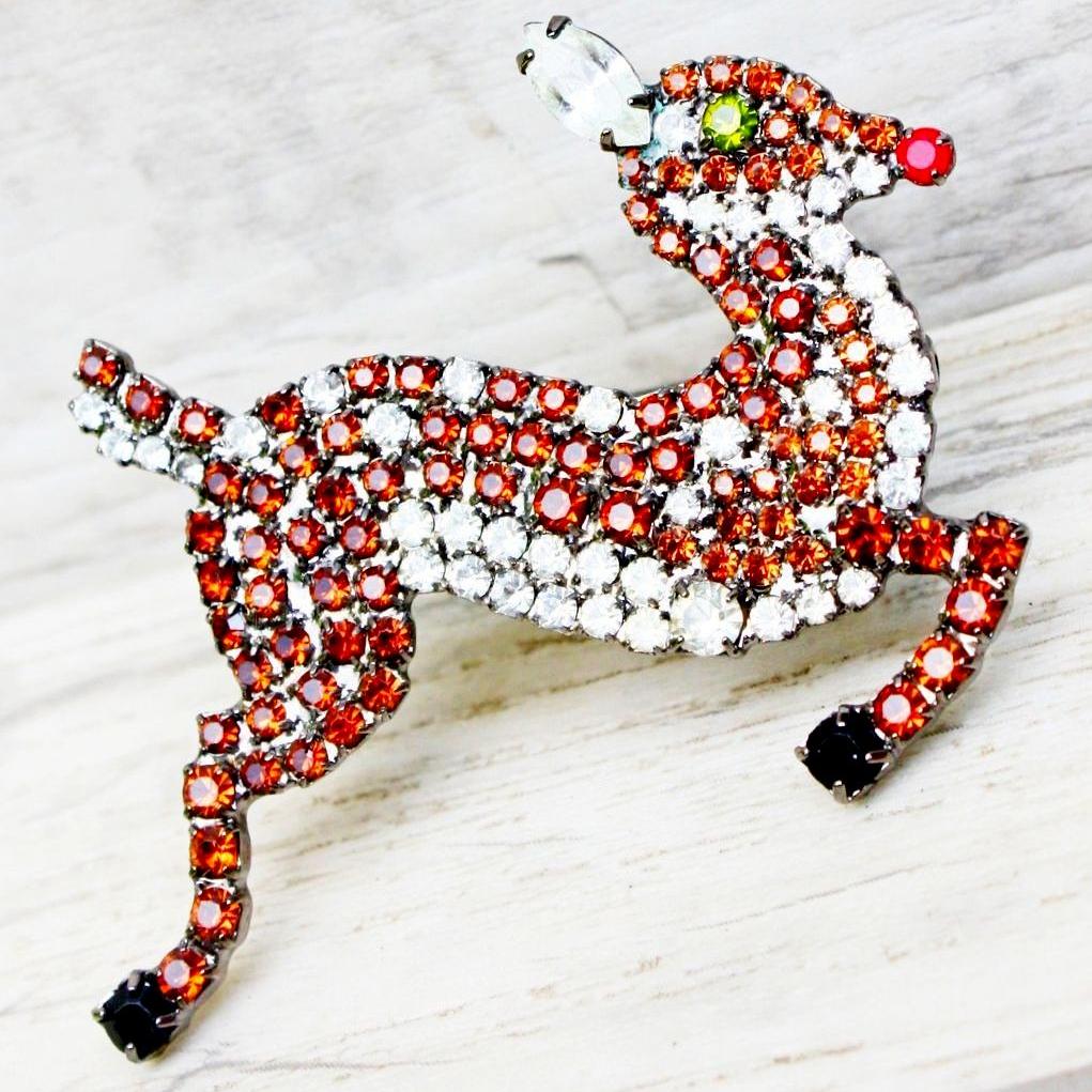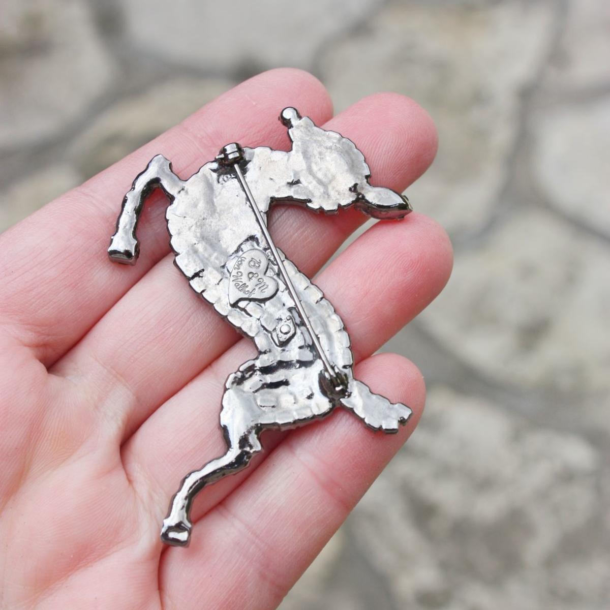 Интересная, красивая, новогодняя брошь от ювелира - дизайнера Bettina Von Walhof. Изготовлена из ювелирного сплава, гематитового покрытия и кристаллов Сваровски. Брошь меняет свой цвет, в зависимости от освещения. Относится к категории "book - piece", украшение, упомянутое в каталоге ( Christmas Pins Jill and Micheal Gallina). Маркирована. Отличное состояние.