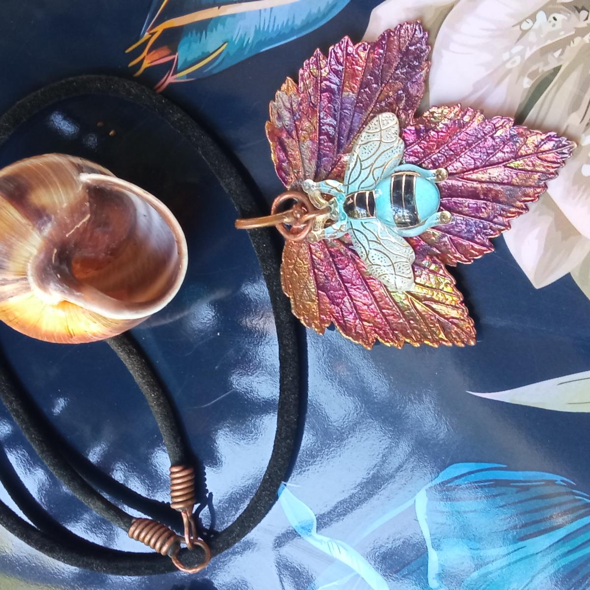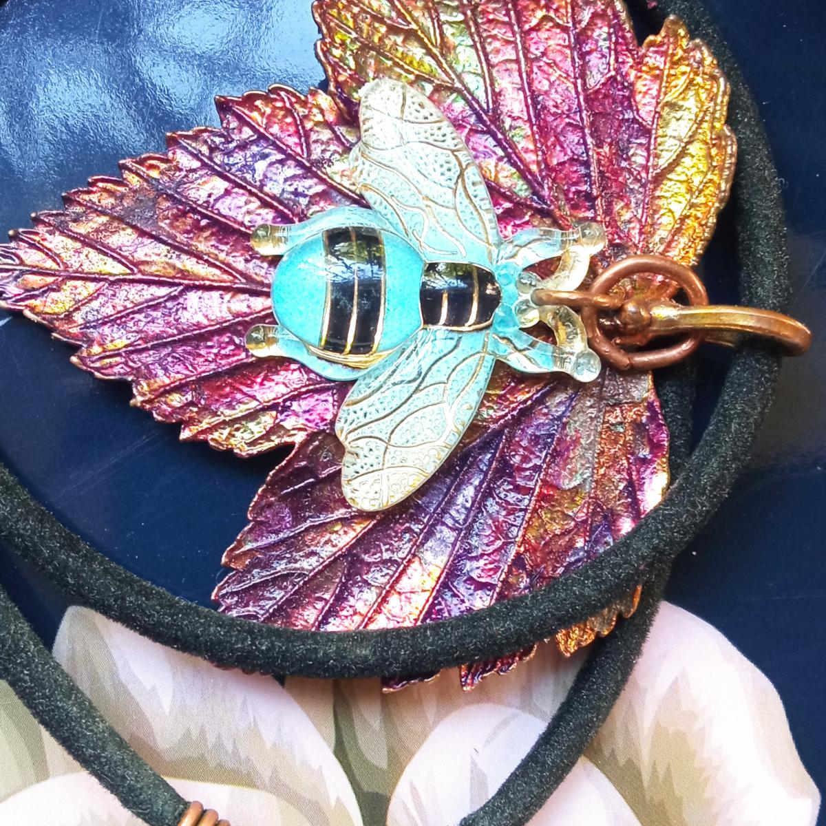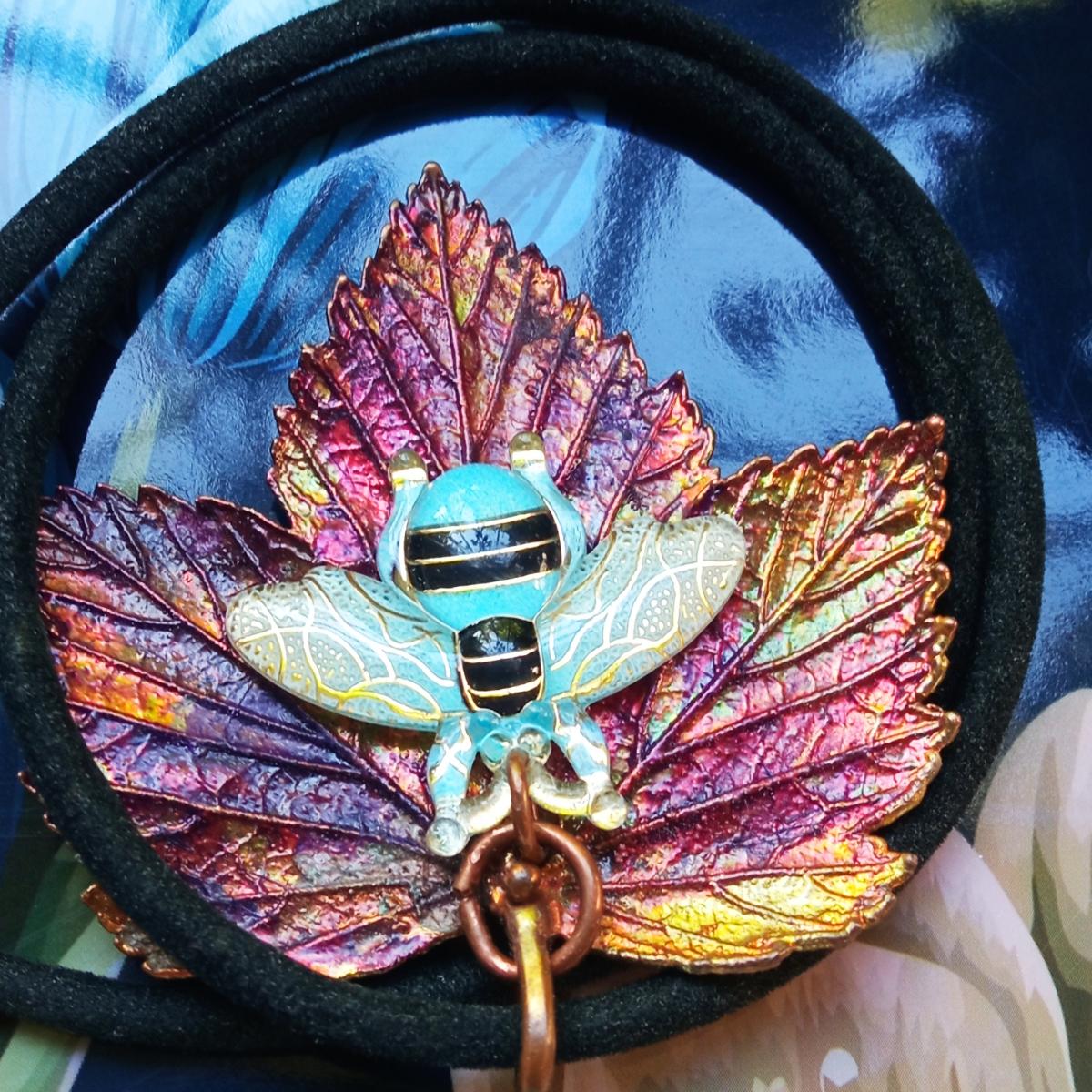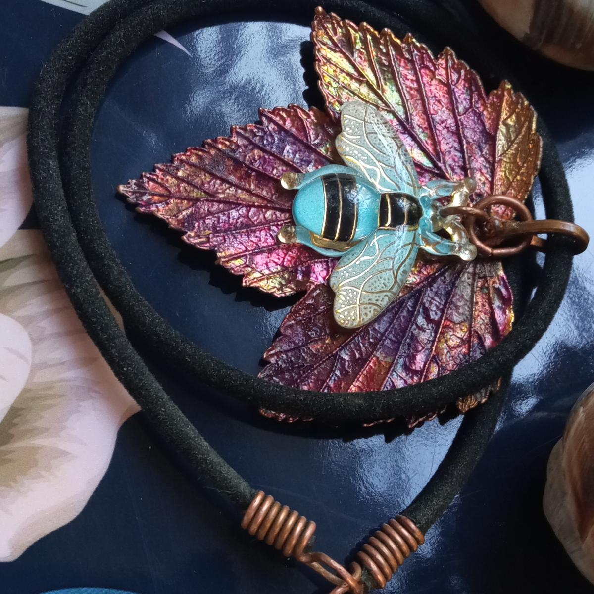 Центральным акцентом композиции служит акриловая пчёлка. Дополняет образ черный бархатный шнурок, концы которого завершаются фурнитурой ручной работы.