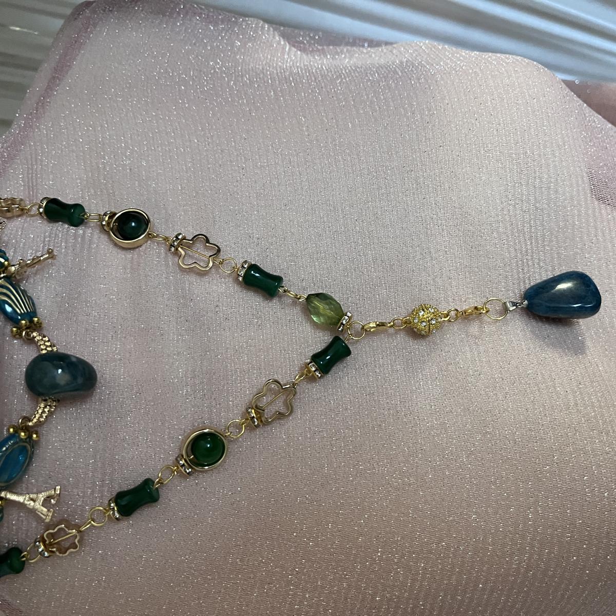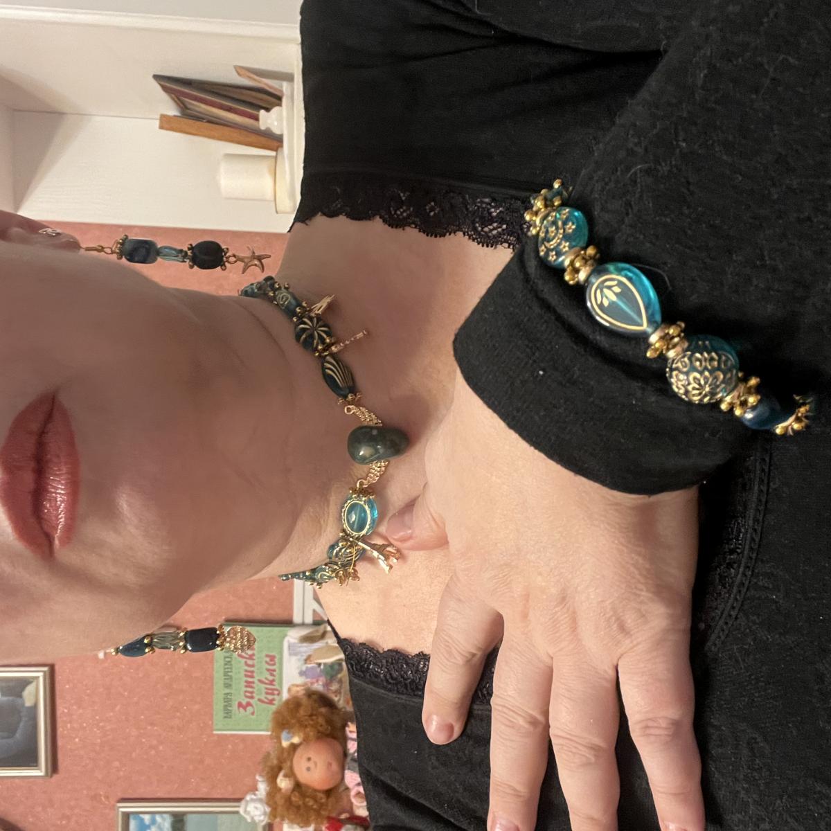 Комплект  украшений в винтажном стиле, сочетающий немеркнущую красоту востока с современными тенденциями. В центре композиции - мистический лабрадорит. Оттенки изумрудного и глубокого синего оттенят и наполнят выразительность любой образ. Комплект состоит из двух частей: короткое и длинное колье с короткими и длинными серьгами и браслетом. Цена указана за мини-комплект. Цена всего образа - 2500₽