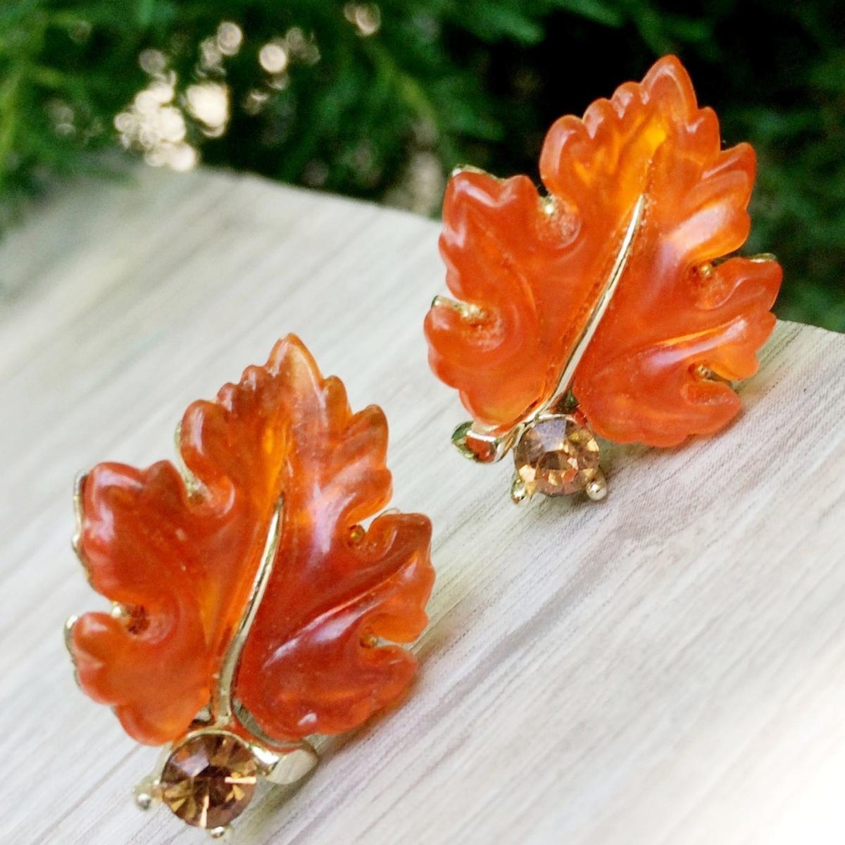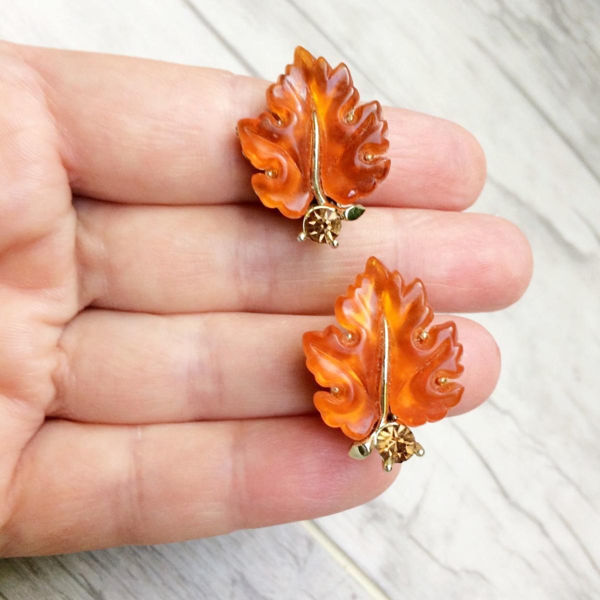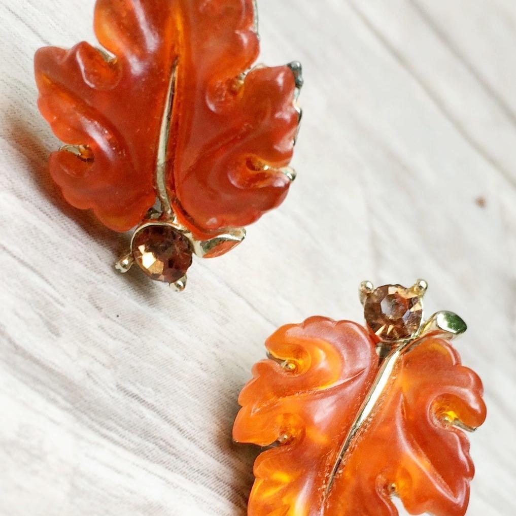 Очень красивые клипсы из ботанической серии конца 1950-х, начала 1960-х годов, от компании Lisner. Изготовлены из ювелирного сплава, родиевого покрытия светло-золотого тона, кристаллов Сваровски и красивого "желейного" люцита, меняющего свой цвет, в зависимости от освещения. Маркированы. Отличное состояние.