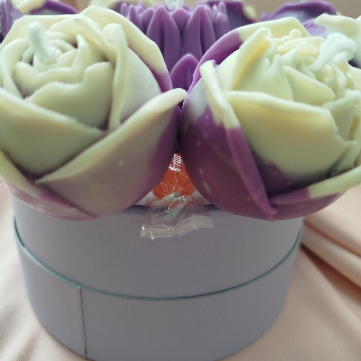 Букет в шляпной коробке - розы 8 шт (4*4,5 см каждая свеча) + 1 лилия (6*5см)