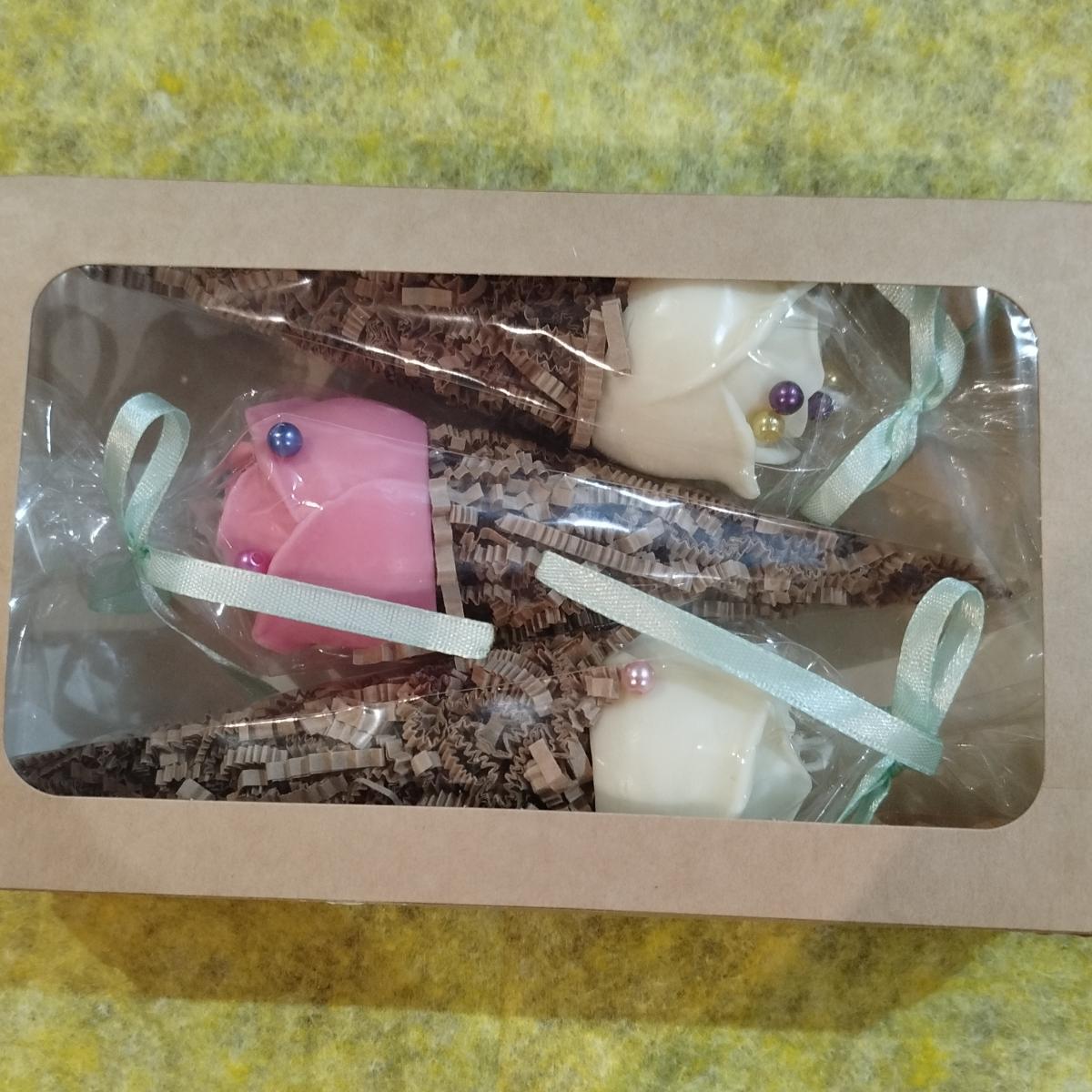 Свеча Роза - 3 шт, 4*4,5 см Ненавязчивый аромат розы. Состав упаковки трех свечей: наполнитель крафт, бусины, упаковочный пакет, лента, крафт коробка. Свеча горит ровно 8+ часов.