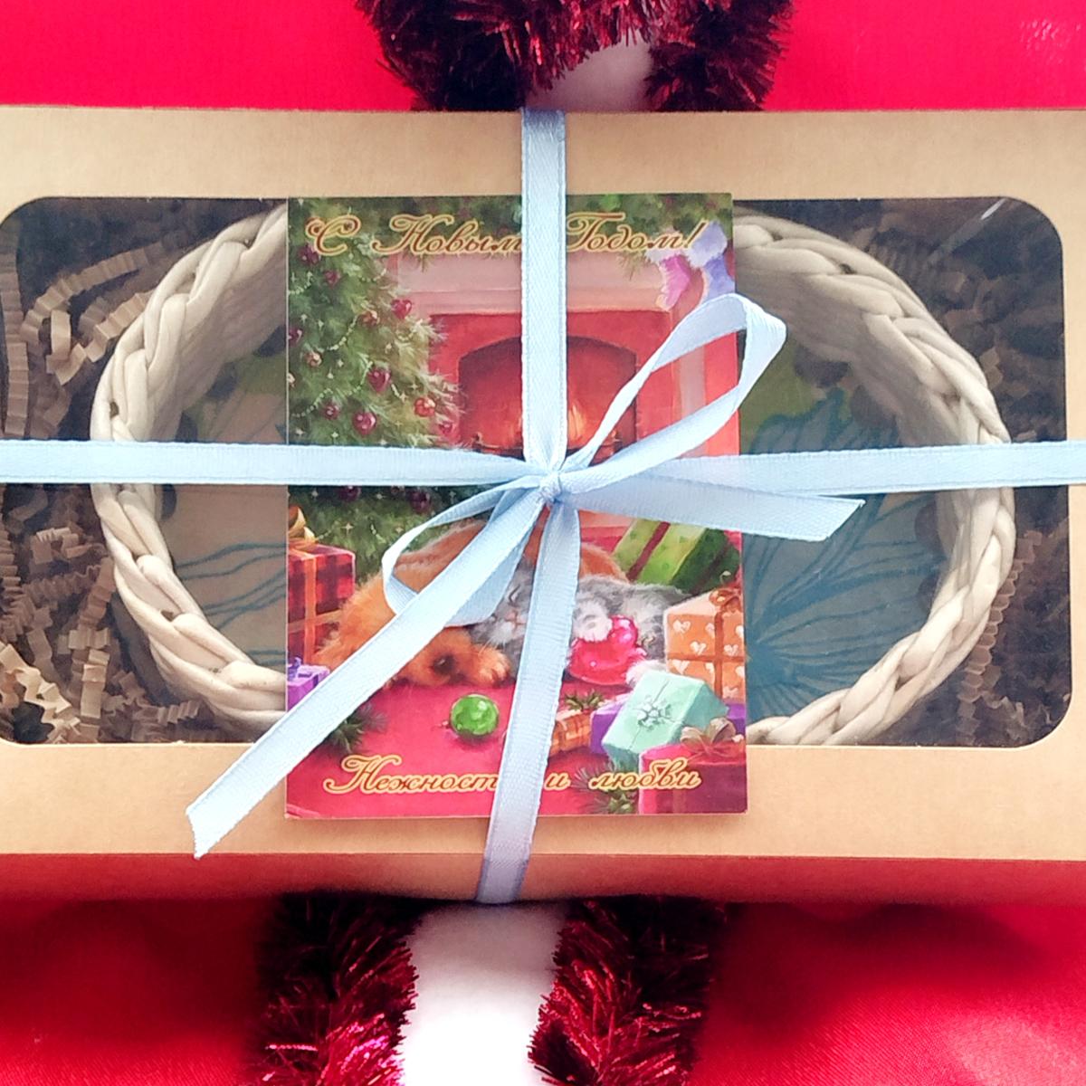 Упаковка - крафткоробка с окном + новогодний декор (открытка, лента, веточка можжевельника) по желанию.