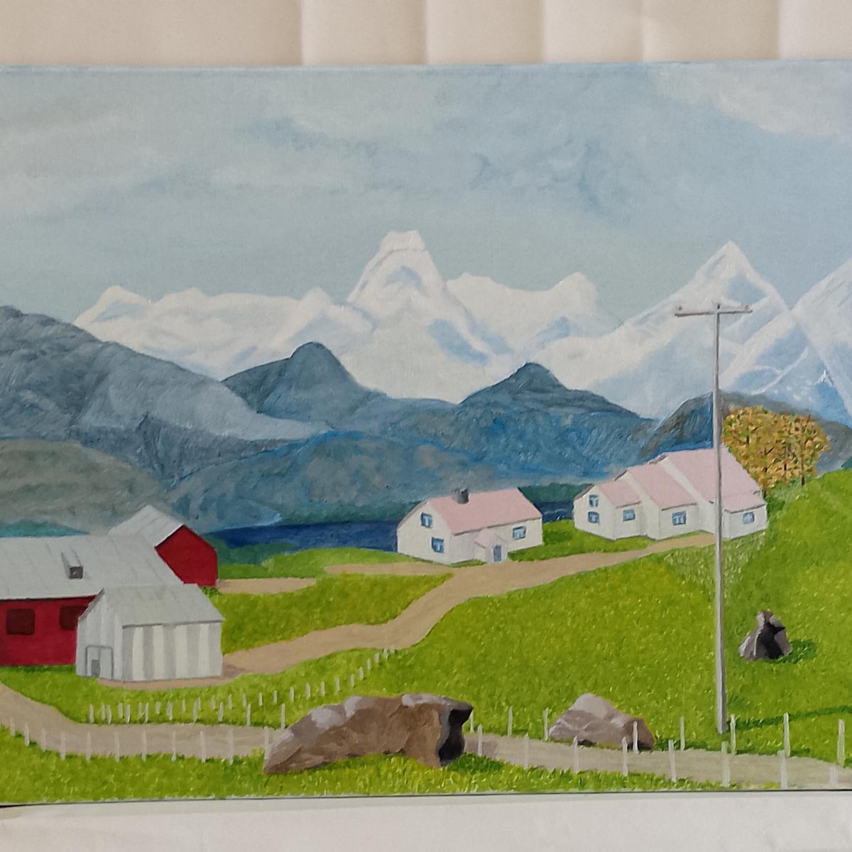 Небольшая ферма в Норвегии на берегу ферда . Это живописное место я увидел в одном из документальных фильмов о Норвегии . Он мне настолько понравился , что я по памяти воспроизвел его на холсте ...